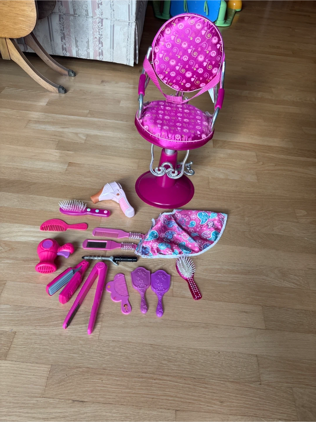 10Our Generation salon chair and accessories set in great condition! Includes the salon chair and various hair styling tools like a hair dryer, curling iron, straightener, brushes, and a styling cape. Please call 604.929.3643