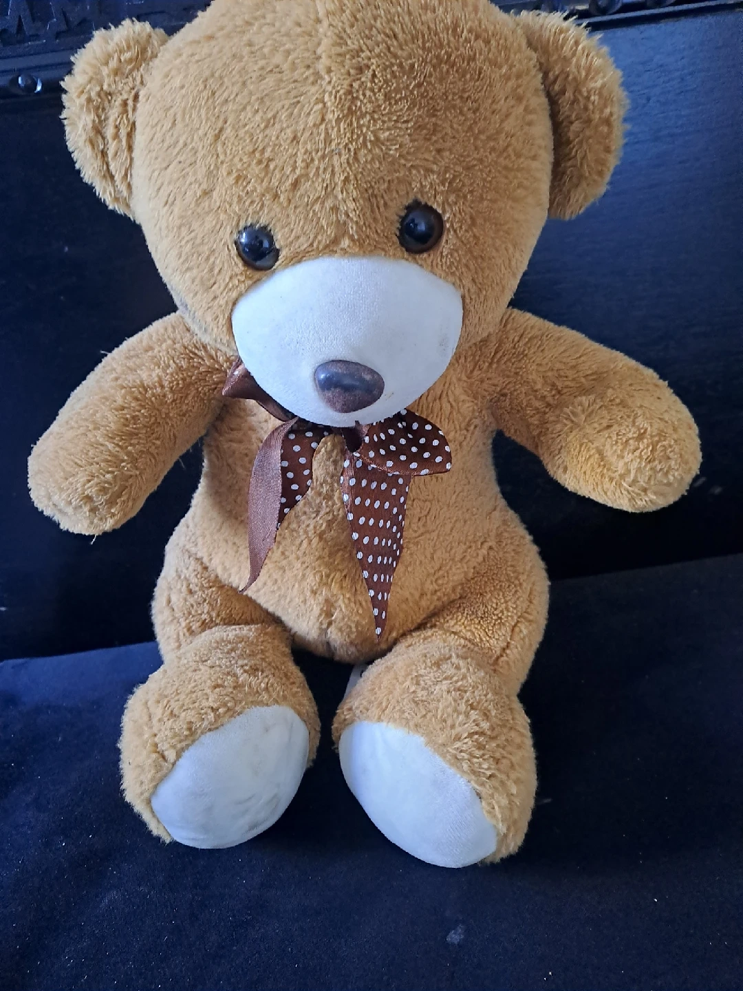 20Voici un adorable ours en peluche brun avec un joli noeud à pois. Il est en bon état