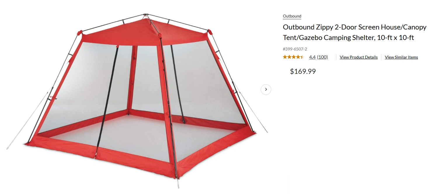 10PICK-UP ONLY This is the 10’ x 10’ version, with 2 zippered entrances, and has only been used twice for drive-in camping. Has always been stored indoors when not in use and includes carry bag. This is a great screenhouse to use around your picnic table or chairs to keep bugs away or to keep chairs/wood/etc. dry during rain. We loved this screenhouse and are only selling due to downsizing space. We are also selling our Woods 6-person cabin tent separately. If you are looking to build a camping setup, we are willing to sell them together for a better deal ($325)