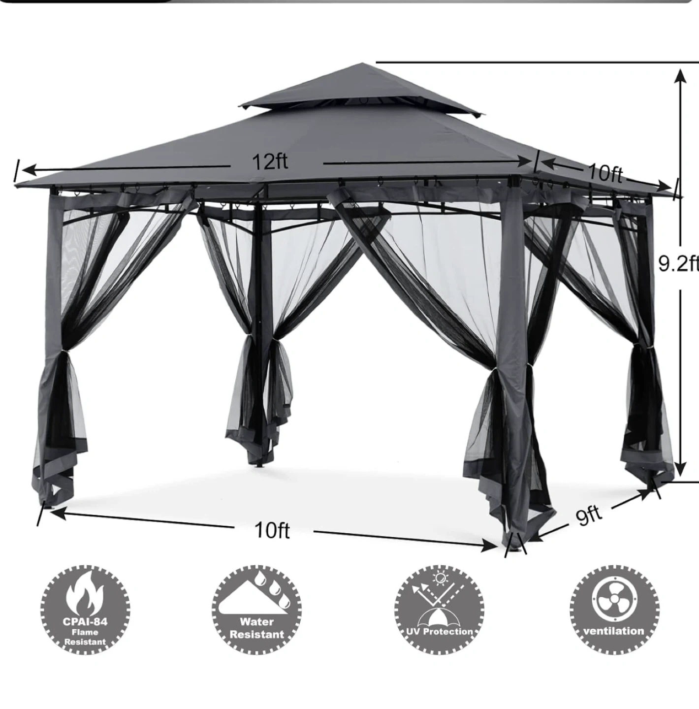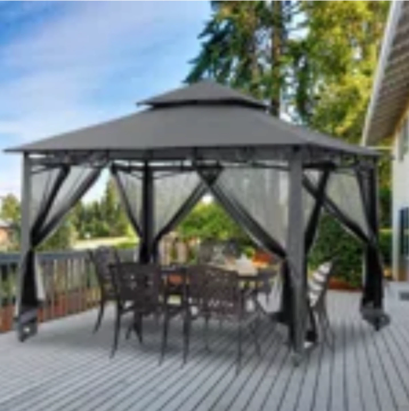 Double roof gazebo perfect for outdoor gatherings! It comes with netting for added protection from mosquitoes and bugs. Great for creating a cozy outdoor space in your backyard or on your deck. Dark gray colour, brand new, open box.