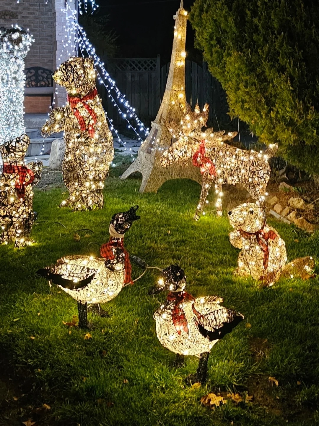 60Selling a set of outdoor Christmas lighted decorations. Includes animal figures such as bears, ducks, a reindeer, and the Eiffel Tower. Great for adding a festive touch to your yard this holiday season!