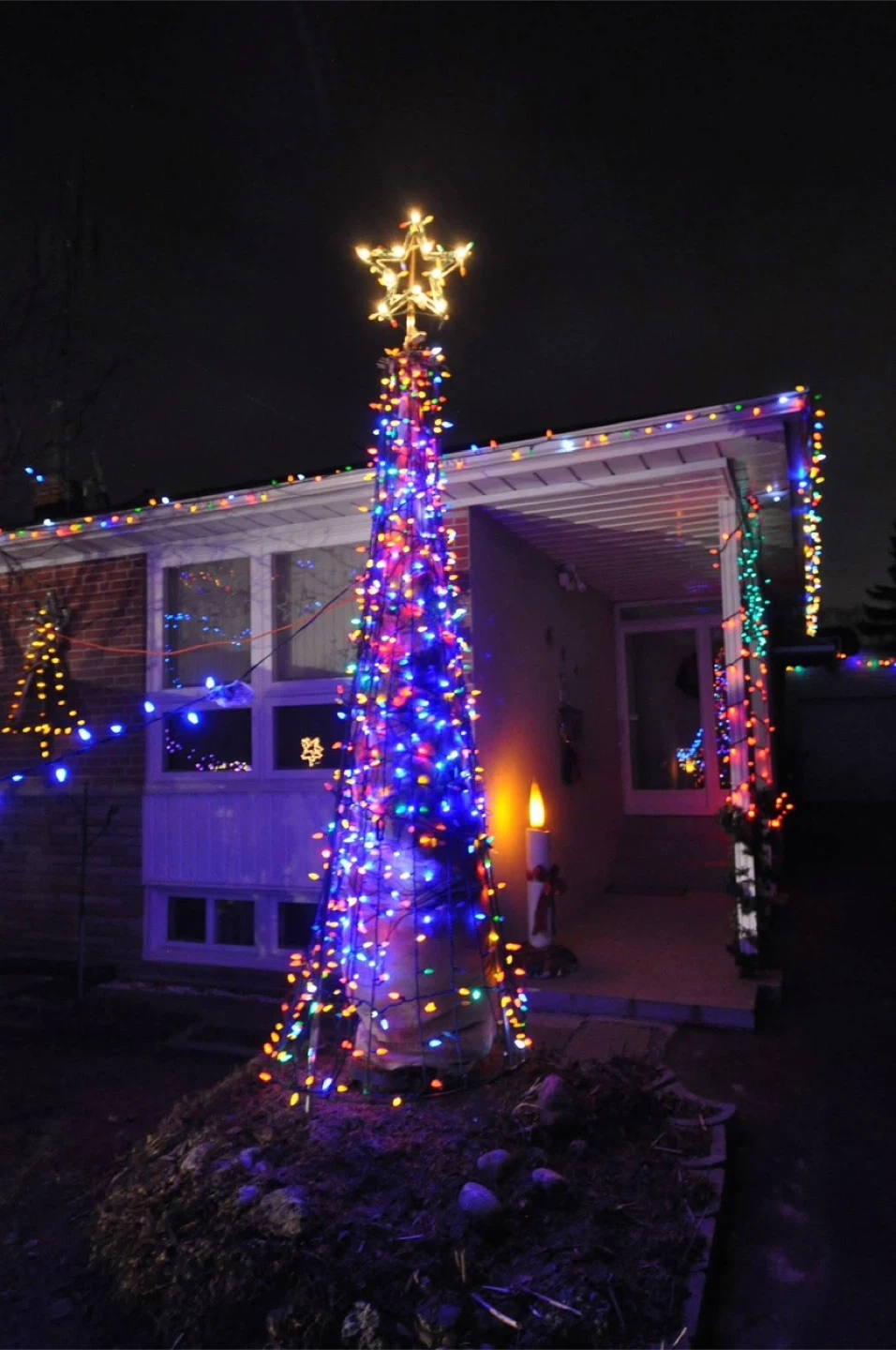 220Get ready to light up your yard with these festive outdoor Christmas tree lights! It's adorned with colourful lights and topped with a custom made bright star. Perfect for adding some holiday cheer to your home this season. Pick up at Islington and Finch.