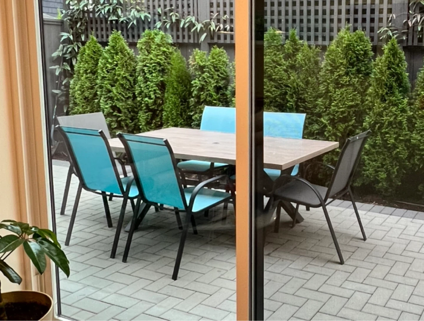Selling an outdoor dining set that includes a table and chairs. 4 blue and 2 grey.