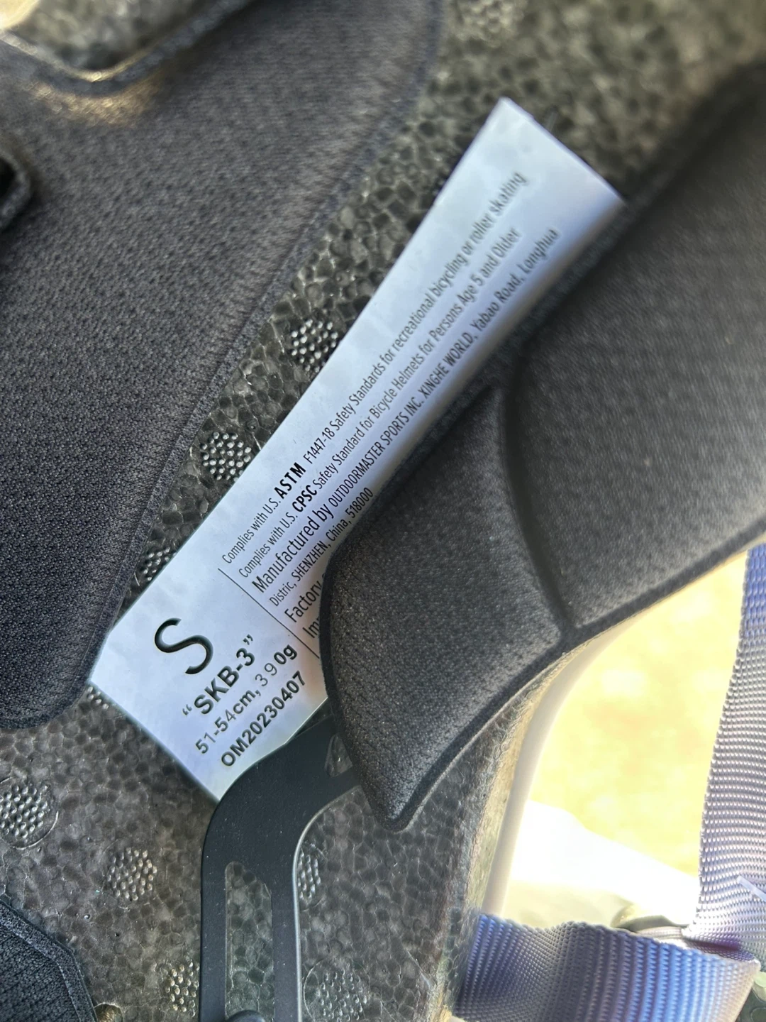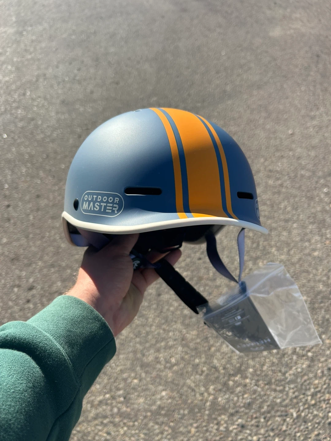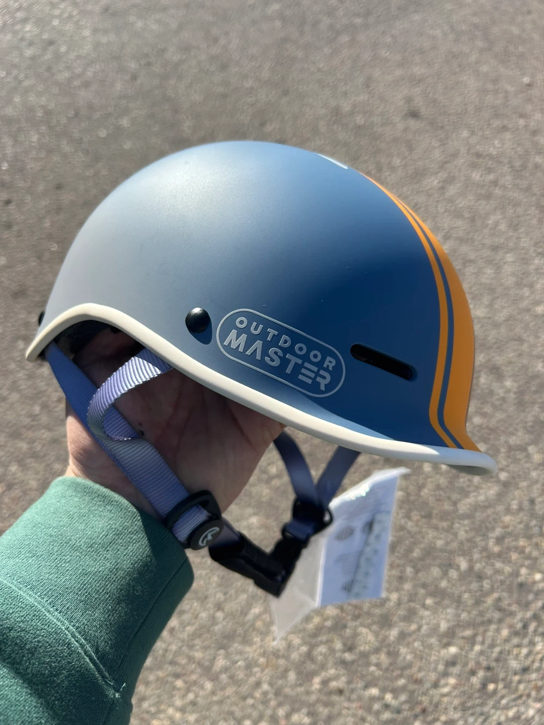 20This is a brand new Outdoor Master bike helmet! It's a size small (51-54cm) and features a stylish blue and orange design. Perfect for recreational biking or roller skating for persons age 5 and older. It complies with U.S. CPSC Safety Standard for Bicycle Helmets.