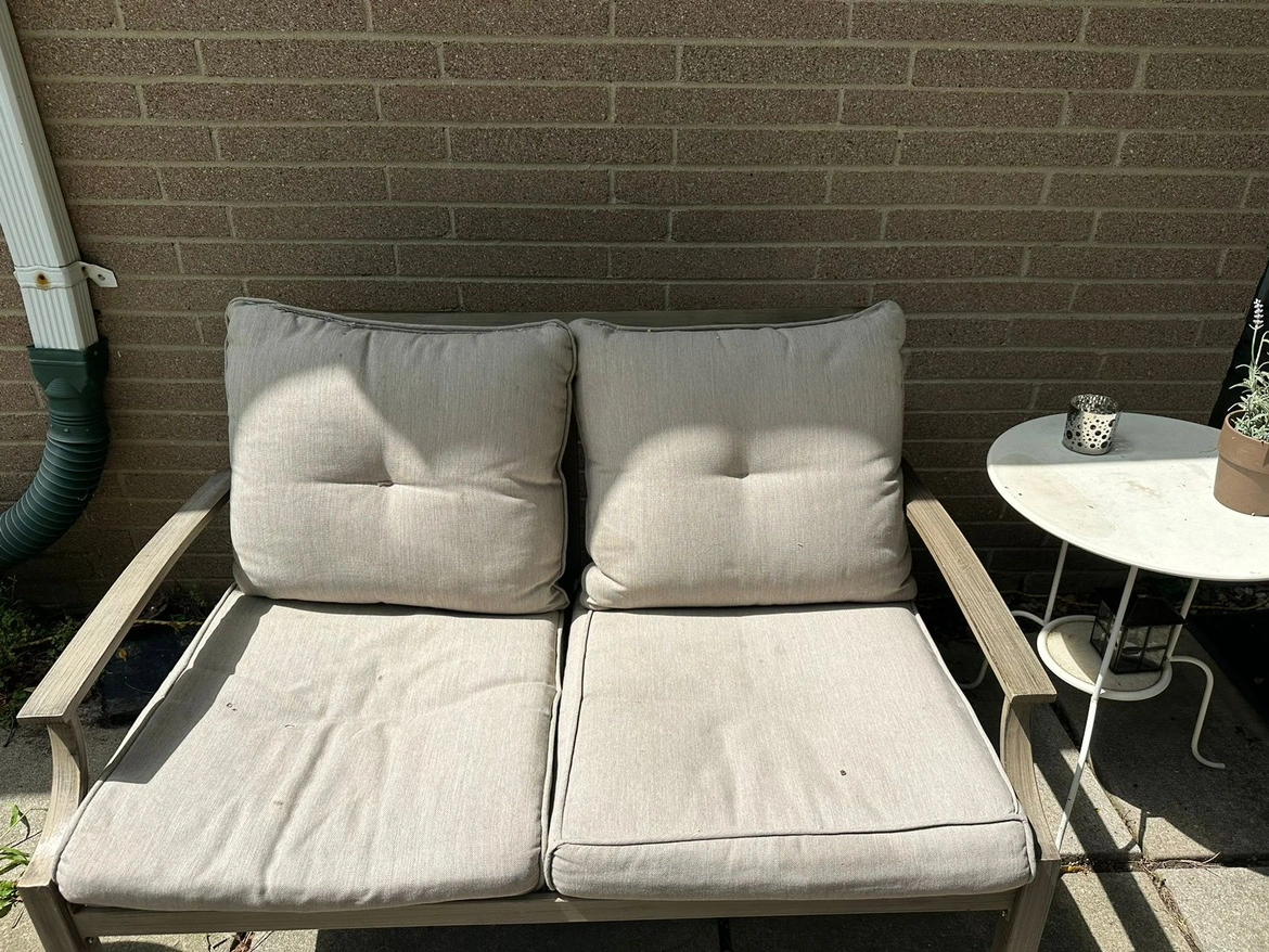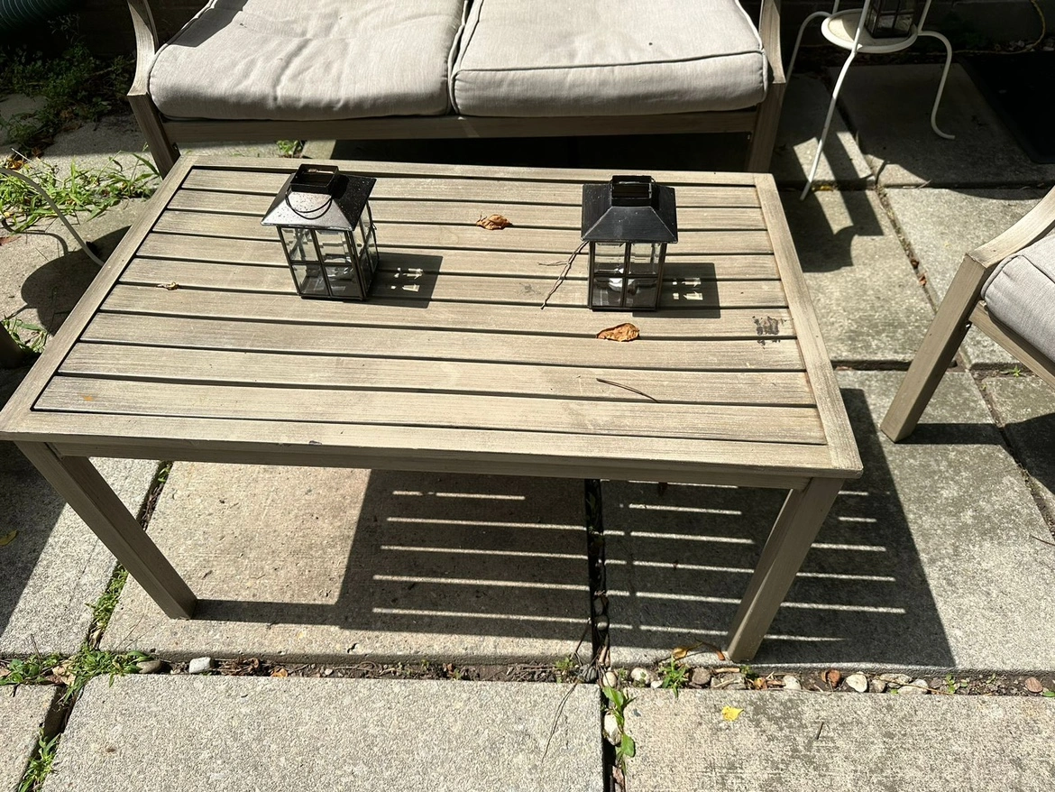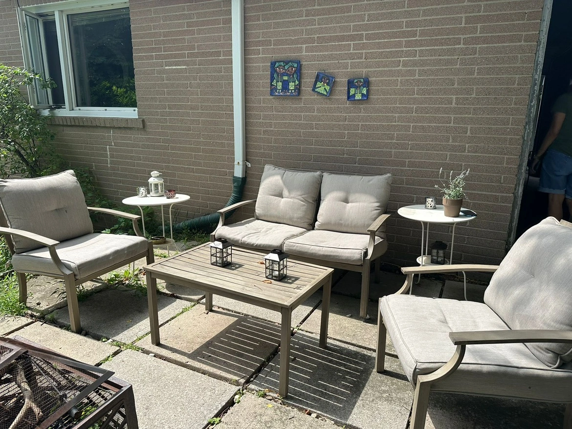 16This patio set includes a love seat, two chairs and a coffee table. The set is in good condition.