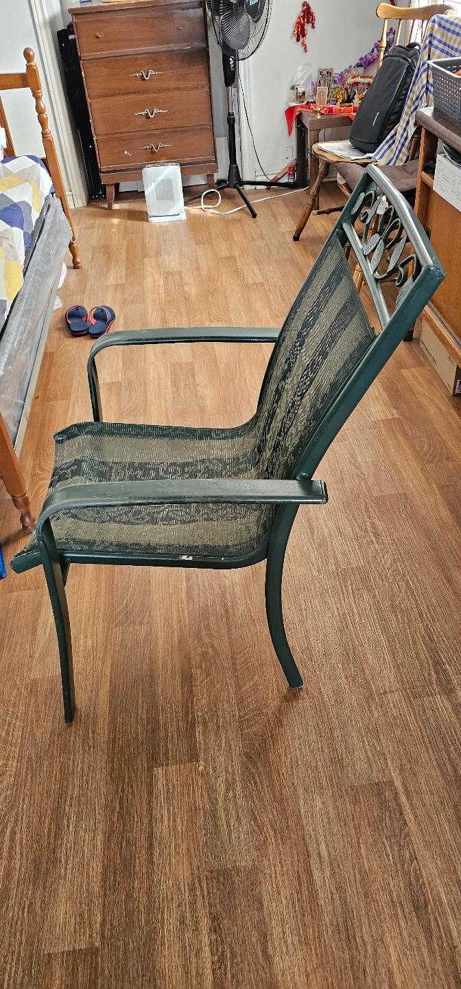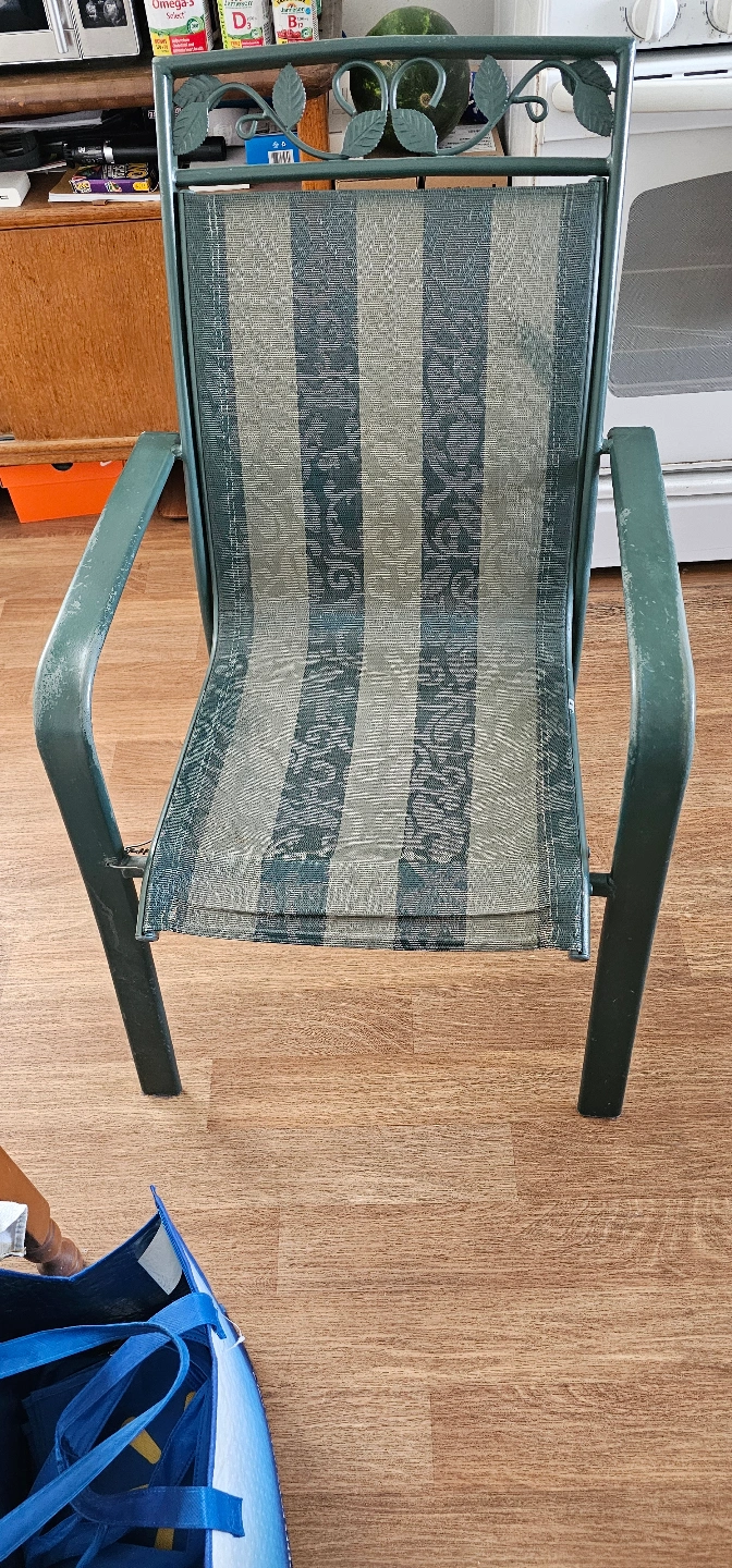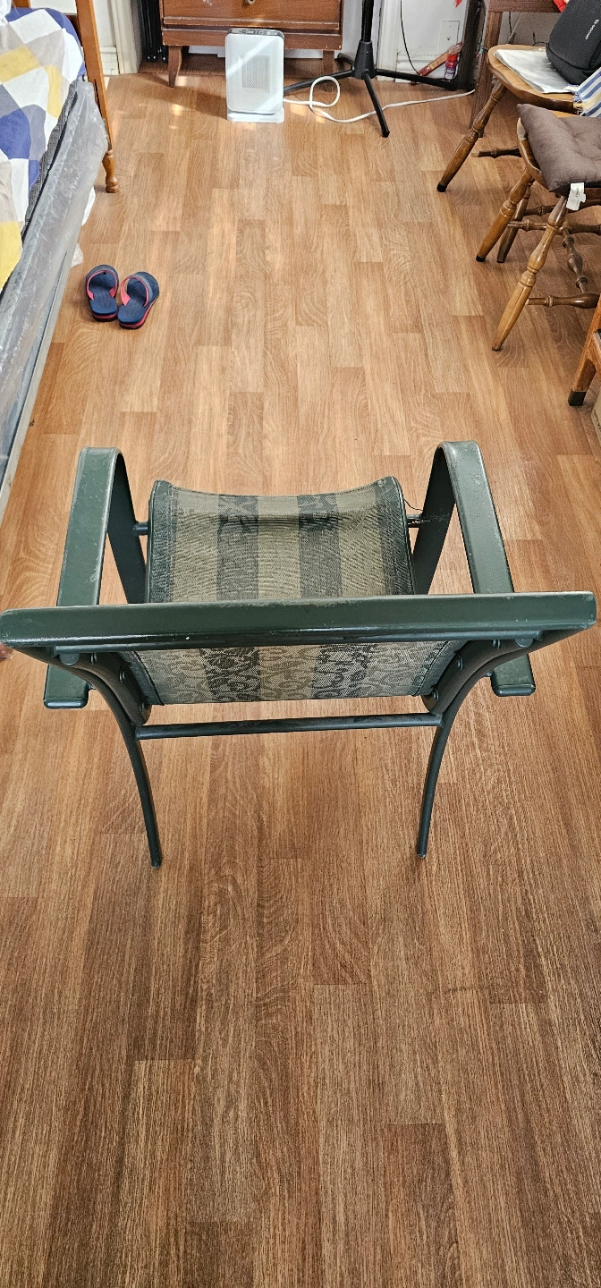 92Metal frame patio chair. Sling seat. Green colour. Shows some wear. Very Comfortable.