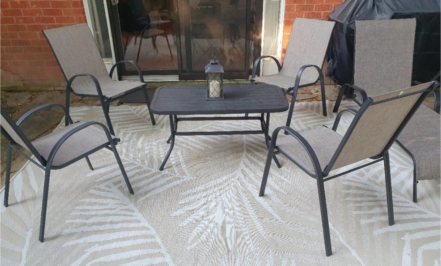 144Selling an outdoor patio set that includes 4 chairs and 1 coffee table, like new. It's perfect for enjoying the backyard during the warmer months.