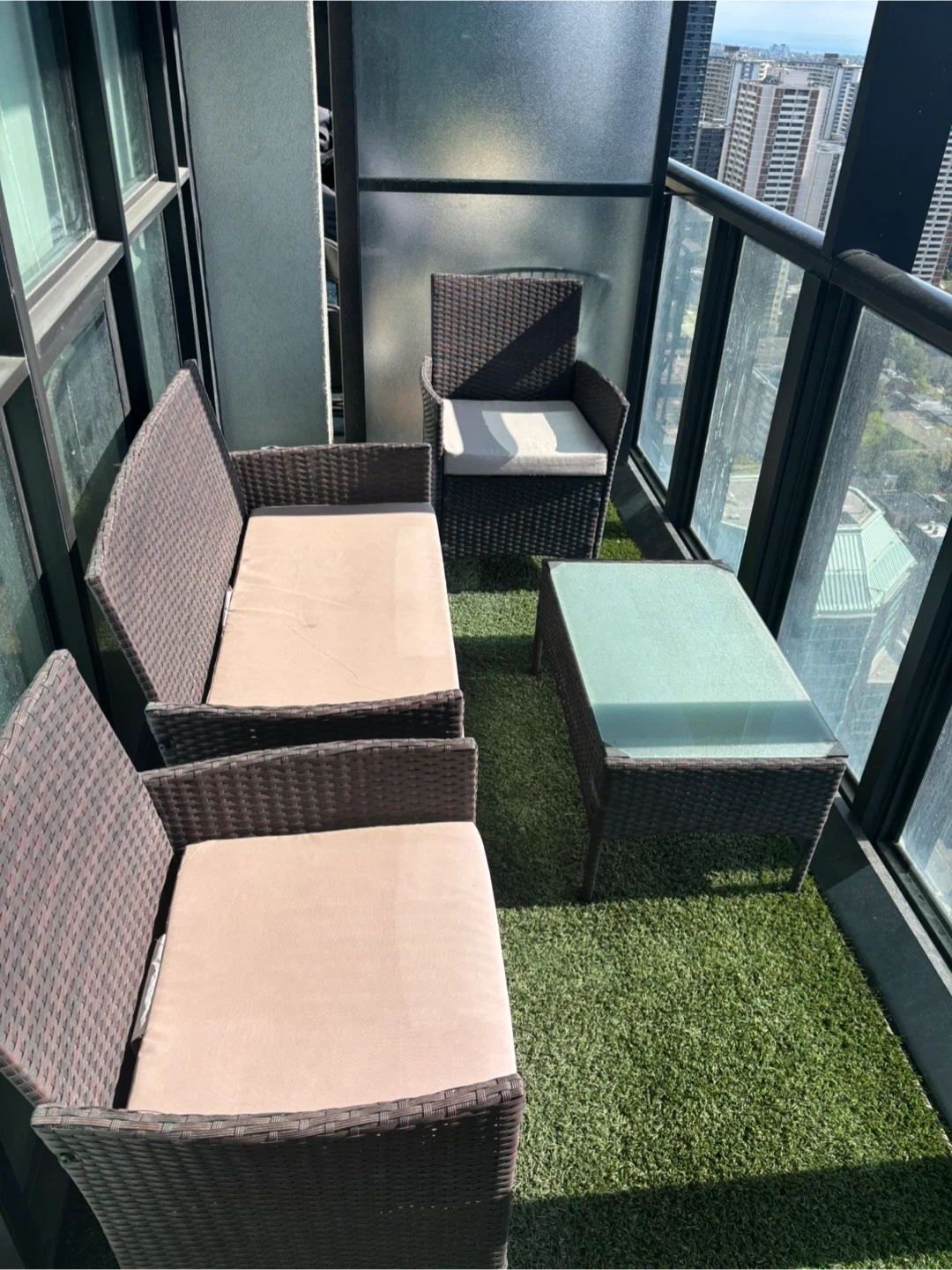 20Patio set includes loveseat, two coordinated chairs and a glass top rectangle table. Cushions included. The foam is in great condition, cushion covers have some discoloration from weather exposure. No damage or tears. Originally bought from Wayfair for $400. Listing below for more details and specs. Pick up from Upper Jarvis. https://www.wayfair.ca/outdoor/pdp/winston-porter-kelsch-3-piece-rattan-sofa-seating-group-with-cushions-c003276477.html?piid=2142203370