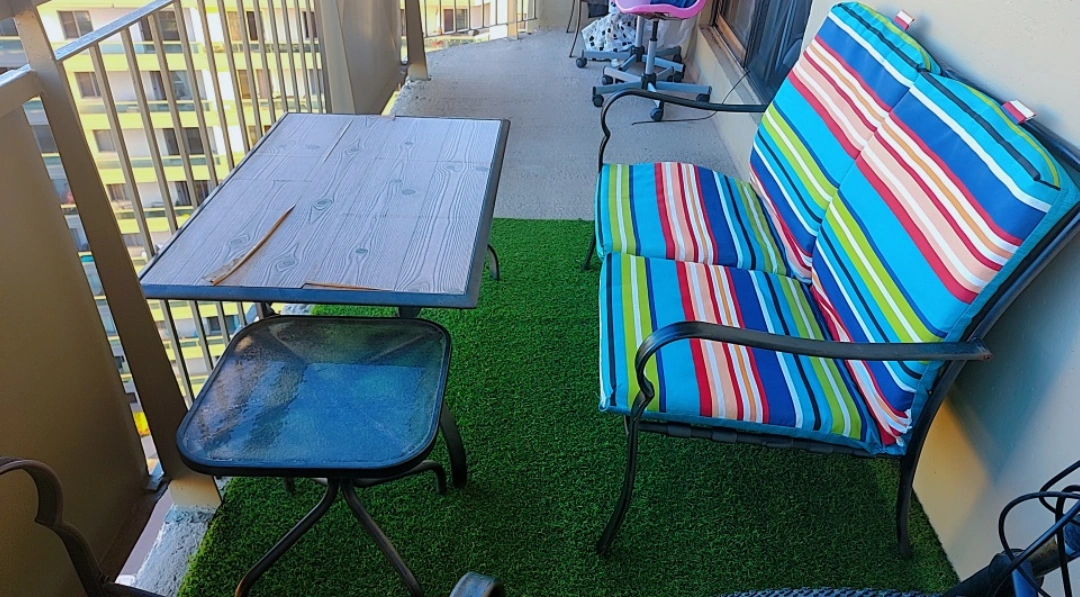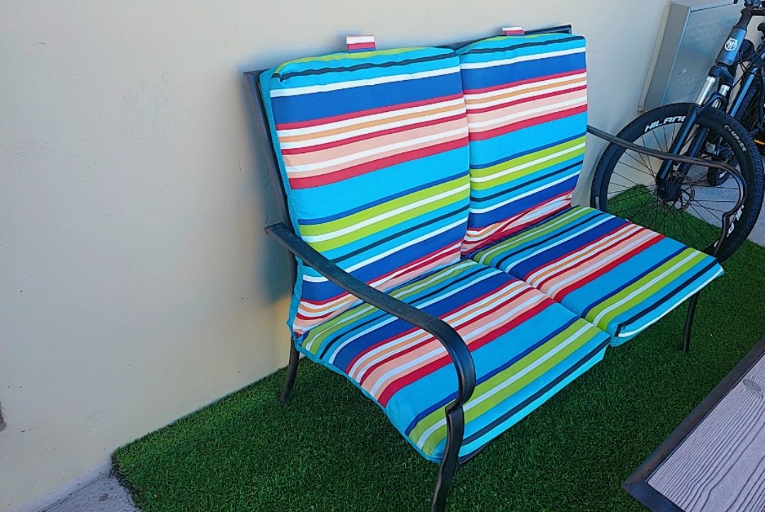 14Cute patio set perfect for a small balcony or outdoor space! Includes a loveseat with colourful striped cushions, a small table, and a matching chair. Great for enjoying the summer weather