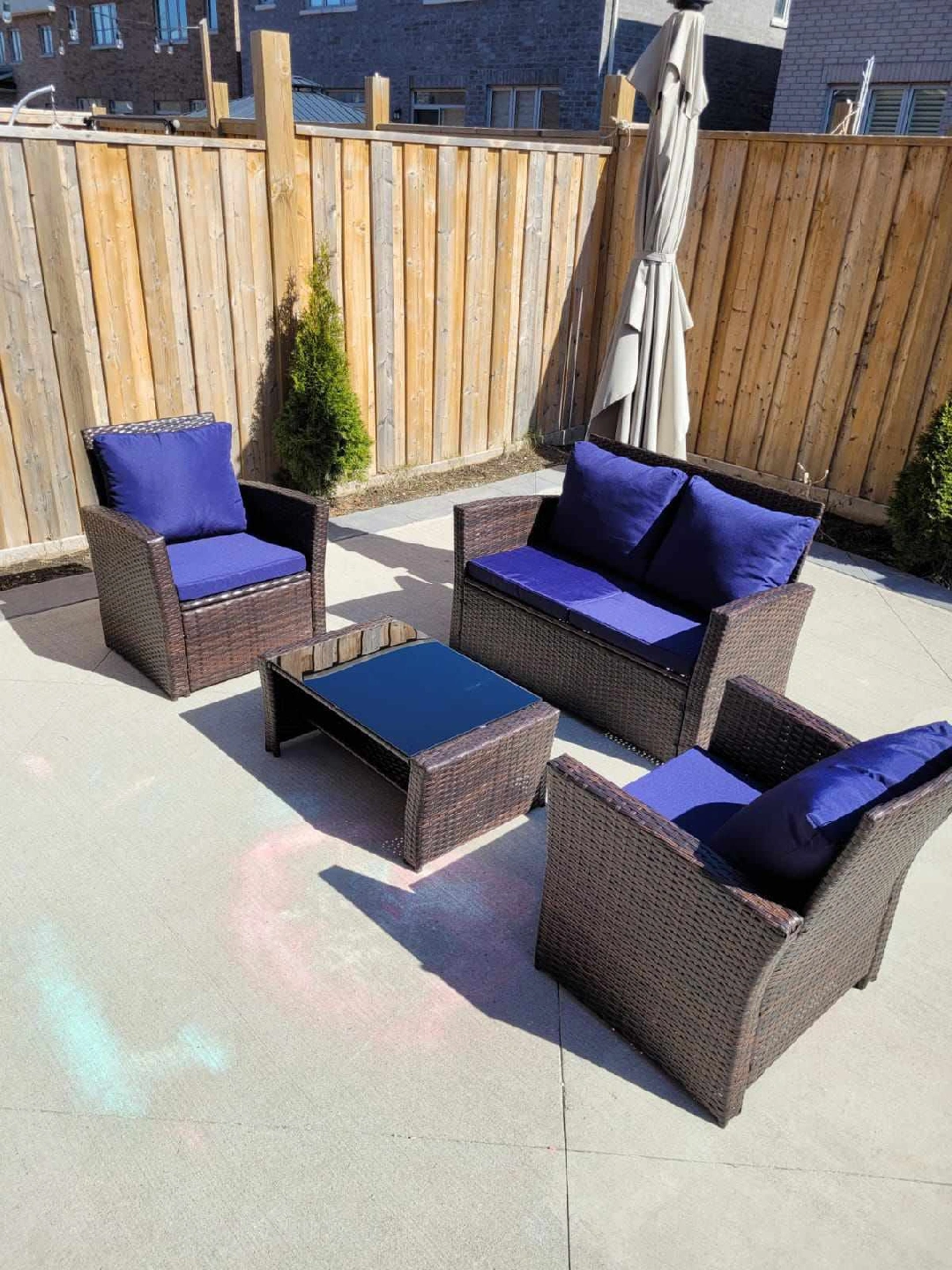15Selling a lovely outdoor patio set! It features a wicker design with comfortable blue cushions. Perfect for enjoying the nice weather in your backyard or on your patio