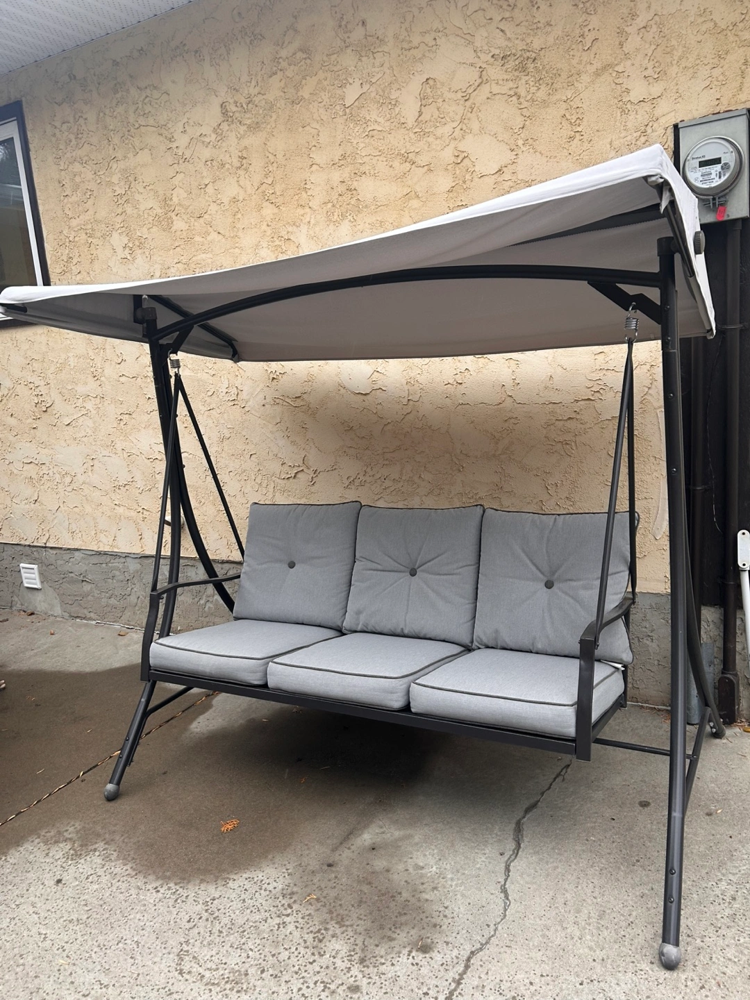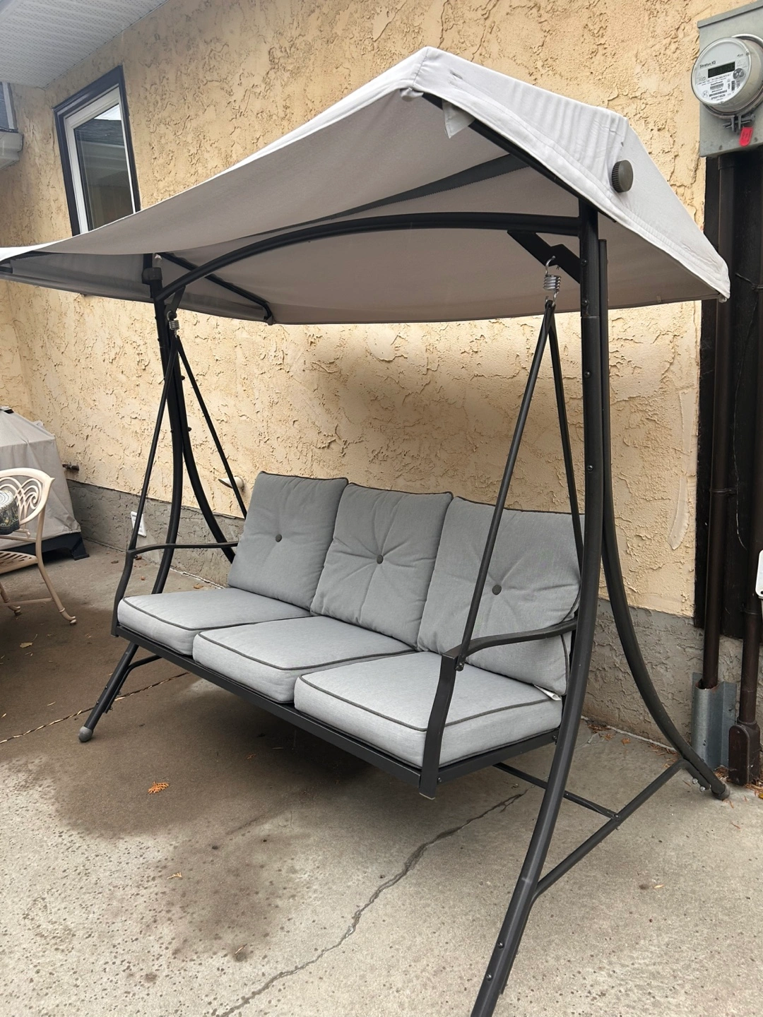 5Selling a comfortable outdoor patio swing. It features a canopy to provide shade on sunny days. The cushions are a neutral grey colour and very clean. It's in great condition and well stored every winter. Cash only sale.