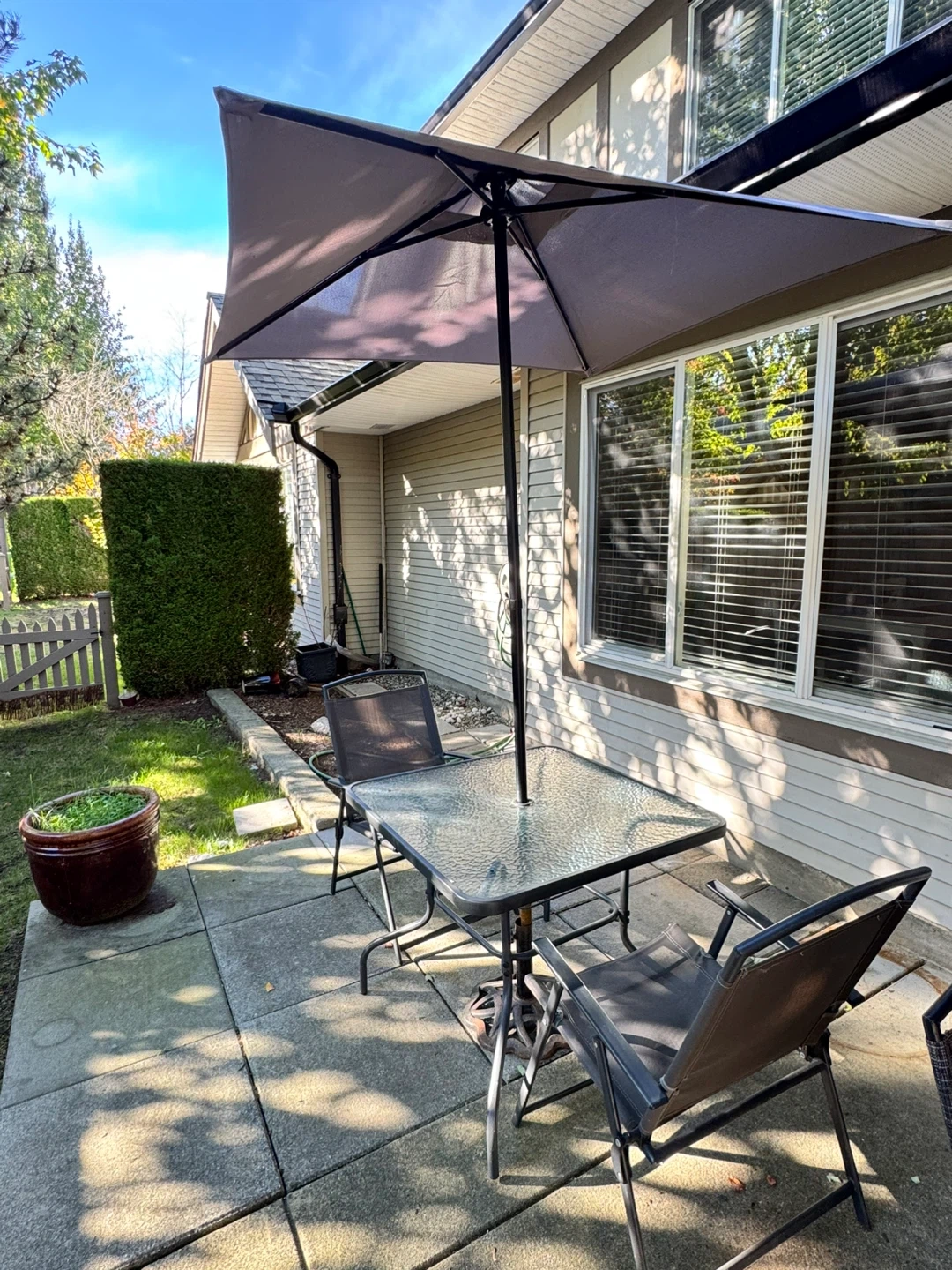 22Outdoor patio set in great condition. Includes: 🪑 2 chairs 🪟 Glass table ☂️ Umbrella with base Everything works perfectly. 📌 One of the chairs has a very small hole (about 1–2 cm), but it doesn’t affect the use or look at all.