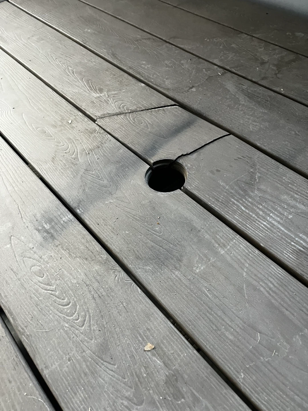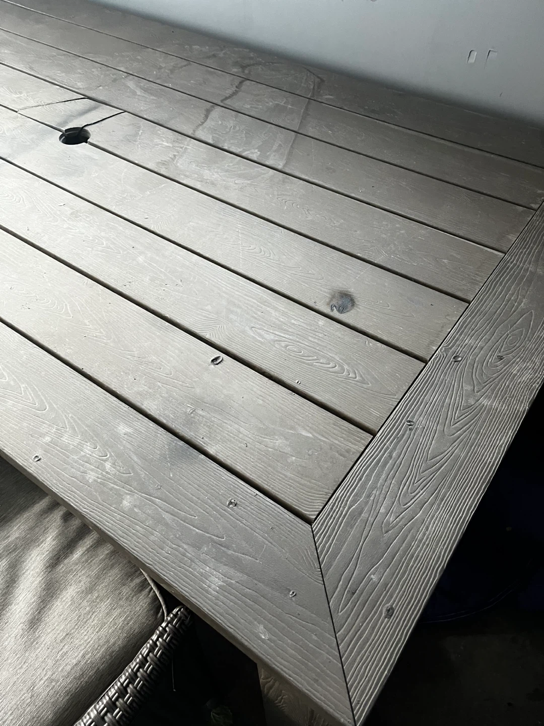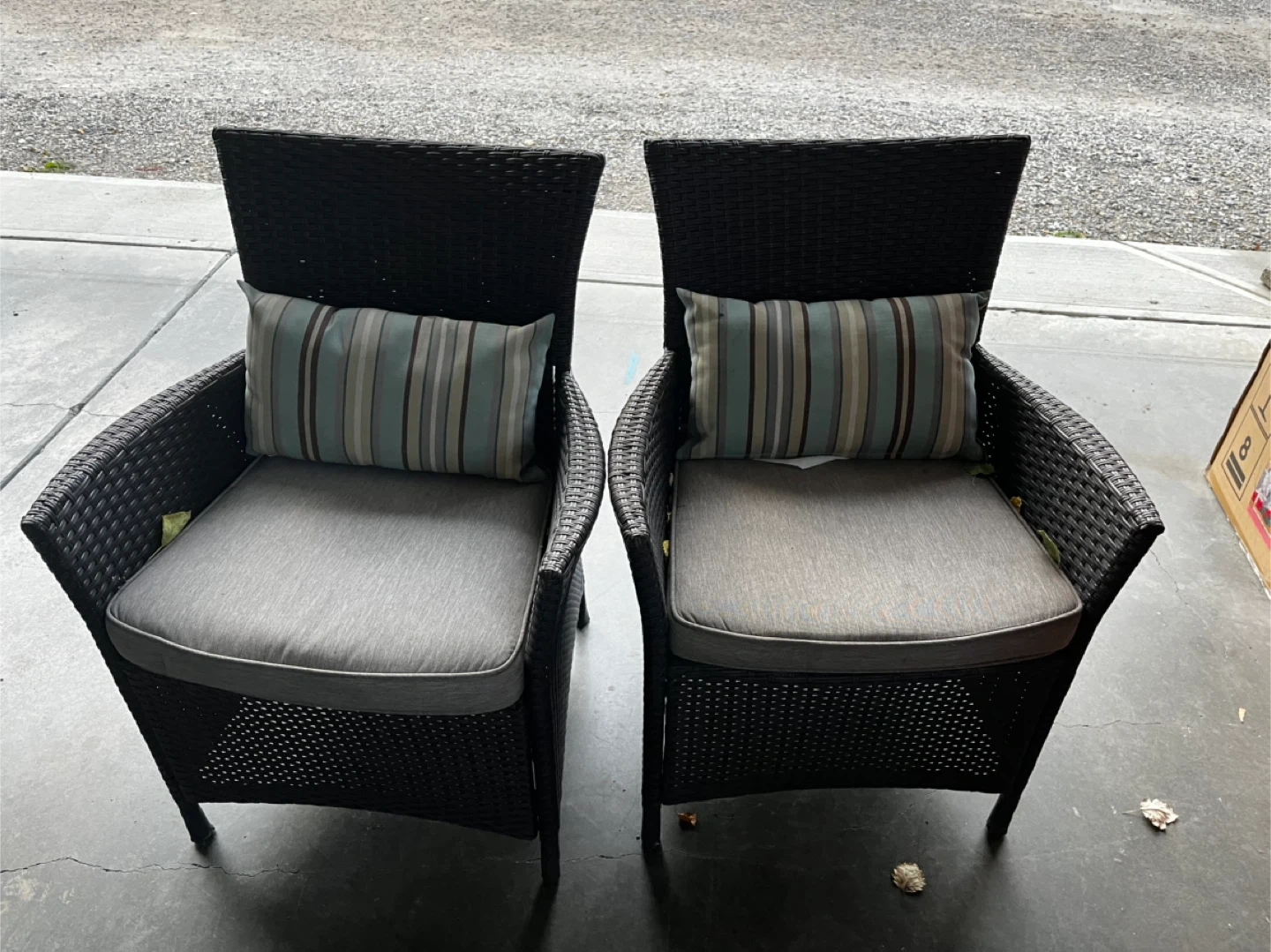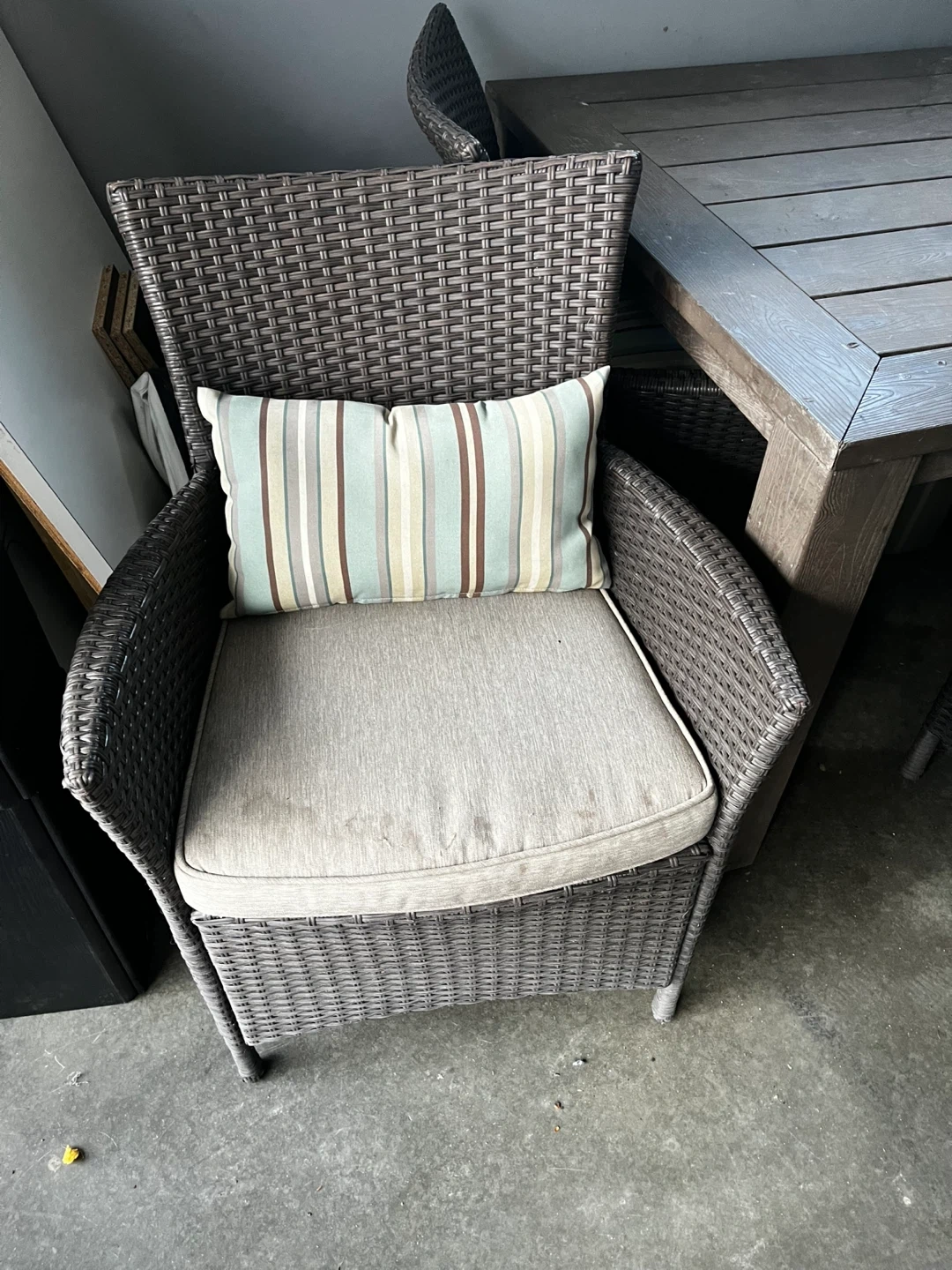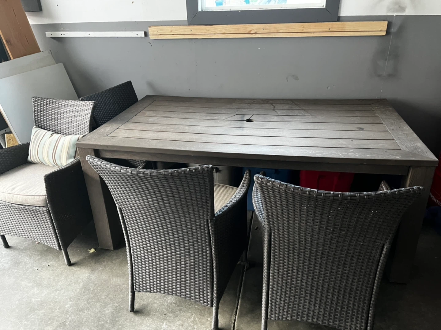 31Selling a used outdoor patio table and chairs set. It includes a table with a hole for an umbrella and four chairs with cushions. The set shows signs of wear but is still functional and perfect for enjoying the outdoors!