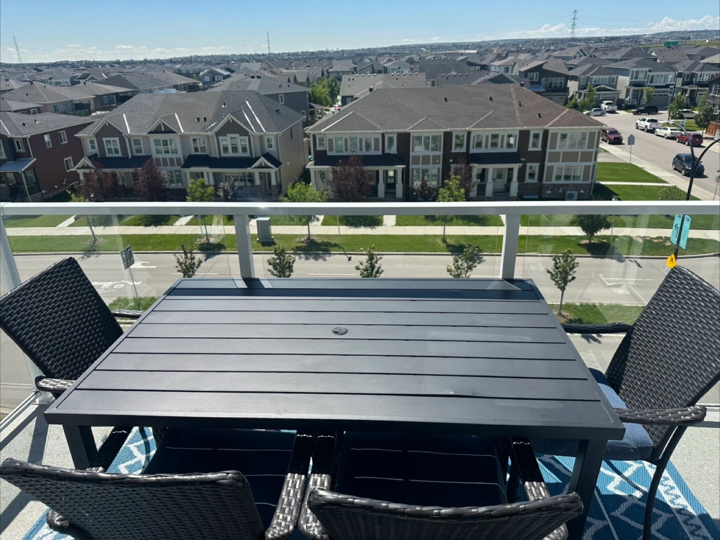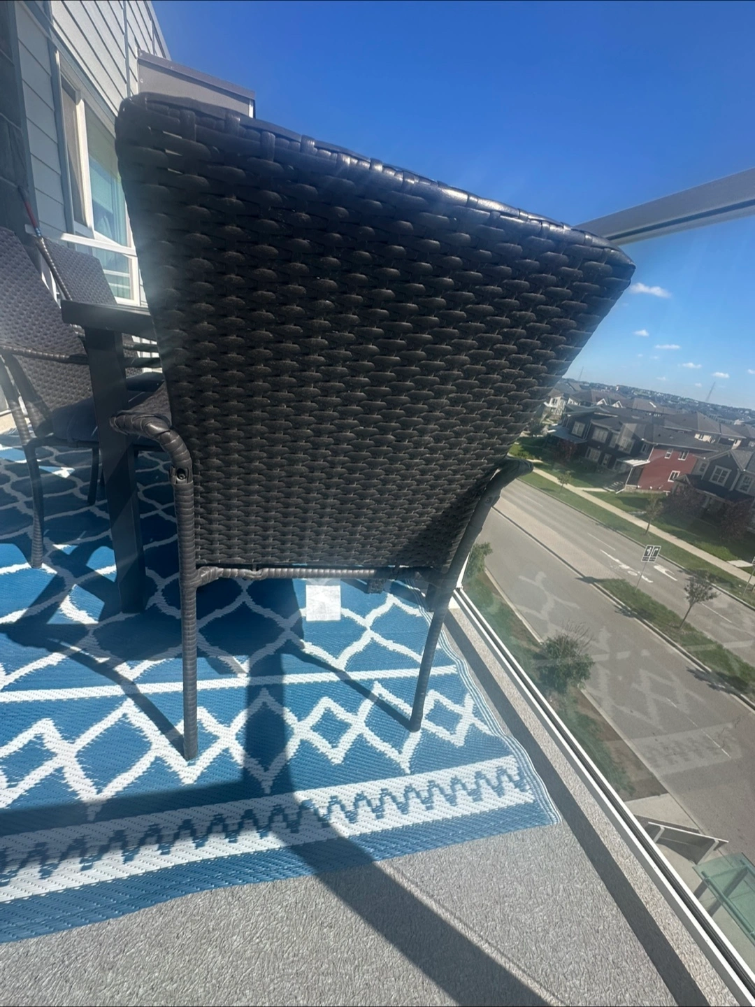 44Selling a patio table with four chairs. It's in great shape and perfect for enjoying the summer weather on your balcony or patio! The table is a black metal and the chairs have a blue cushion. Asking $300 for the set. The patio rug can be taken for an additional $15.