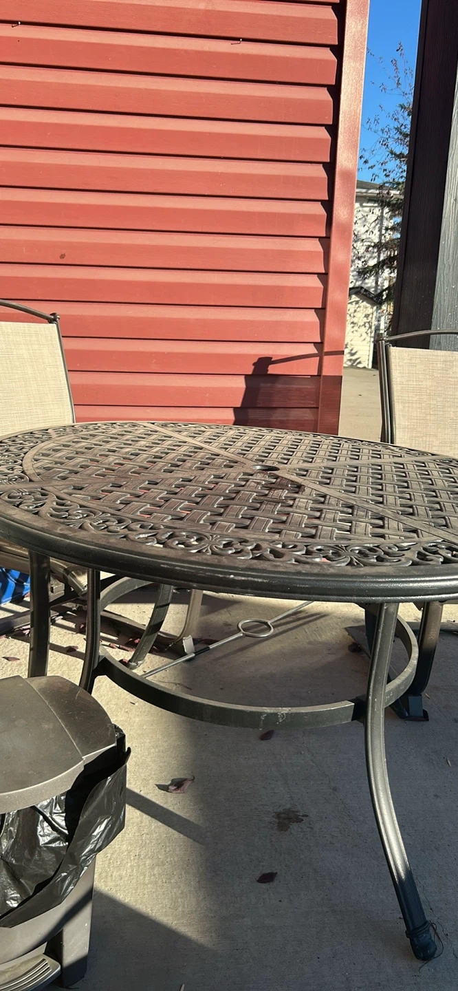 55Selling a round outdoor patio table. It's made of metal and has a nice woven design on the tabletop. Perfect for enjoying some sunshine in your backyard!