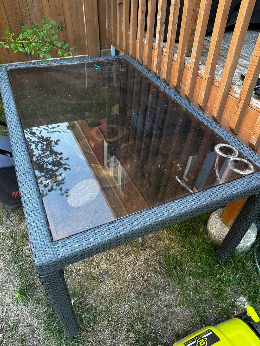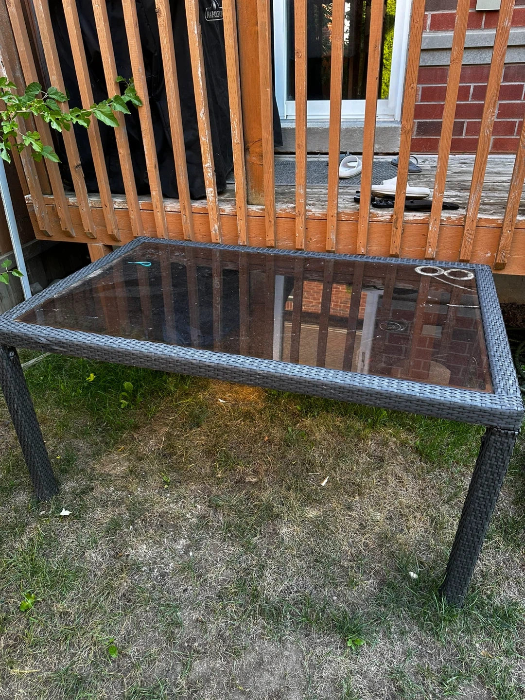 Selling an outdoor patio table featuring a sleek glass top. It's perfect for enjoying meals or drinks outside. The table is in good condition and ready for a new home on your patio or deck. It has a woven wicker-style frame and dark legs.