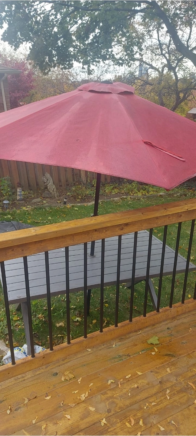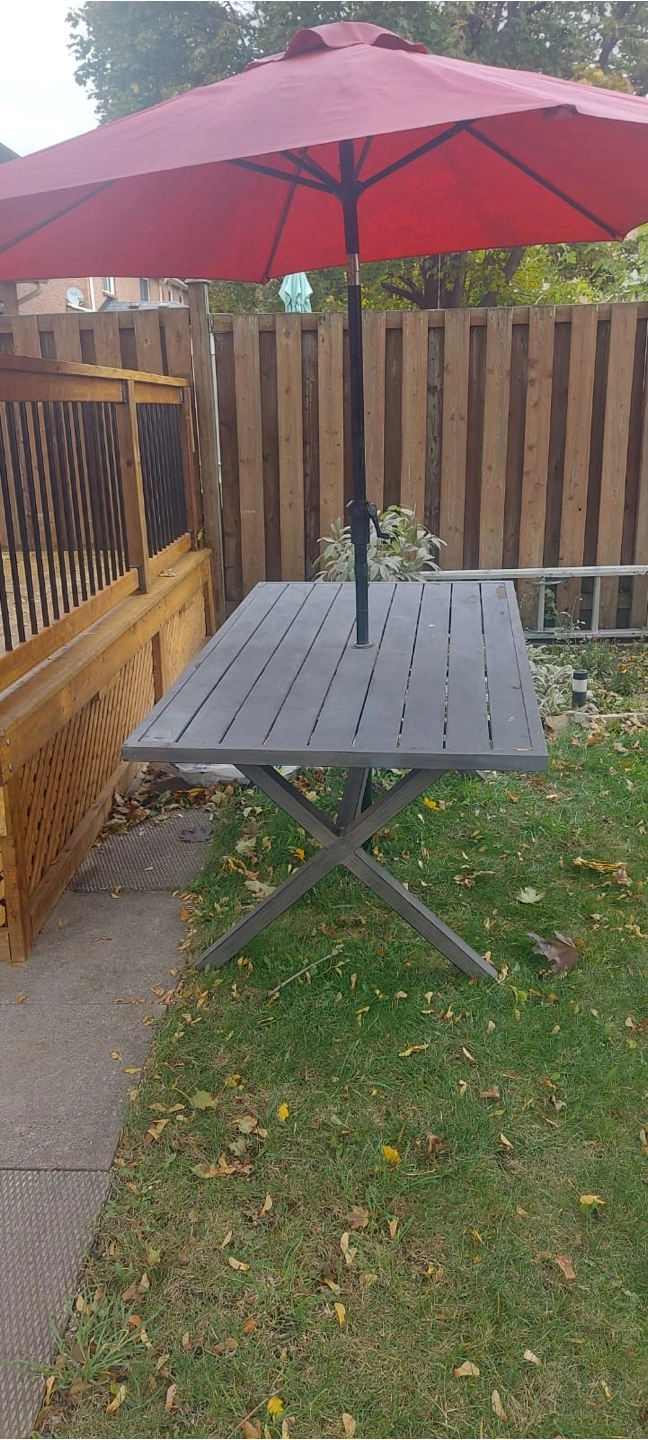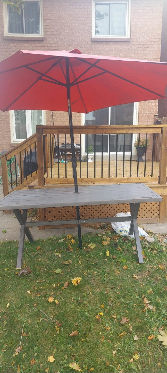 96Outdoor table and umbrella Some minor damages to the table pickup in mississauga