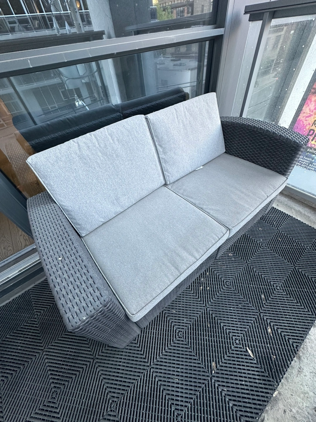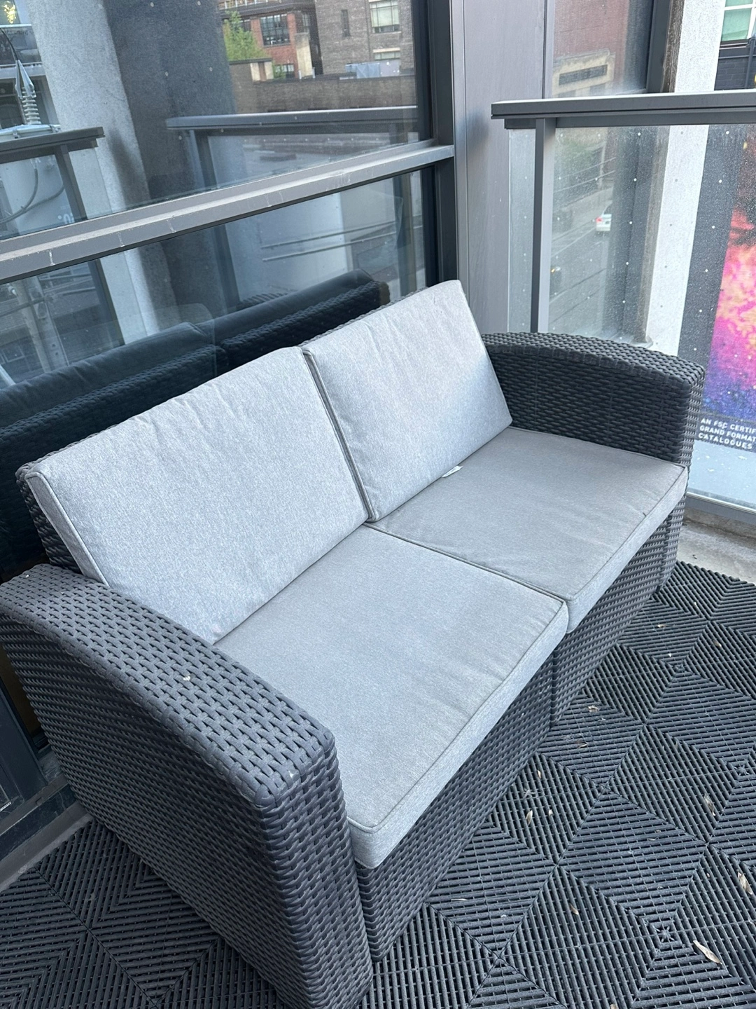 62Two-seater patio loveseat. Grey wicker frame. Light grey cushions. Perfect for small balconies or patios. Accept reasonable offers. Dimensions: Length: 59cm Width: 71cm Height: 58cm