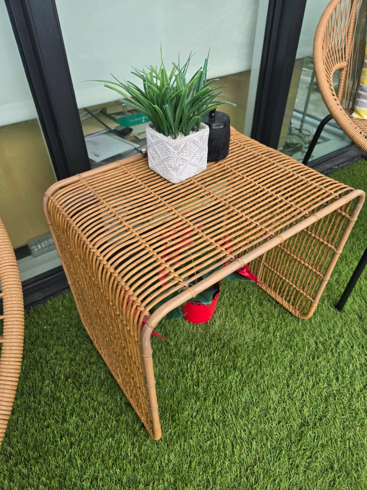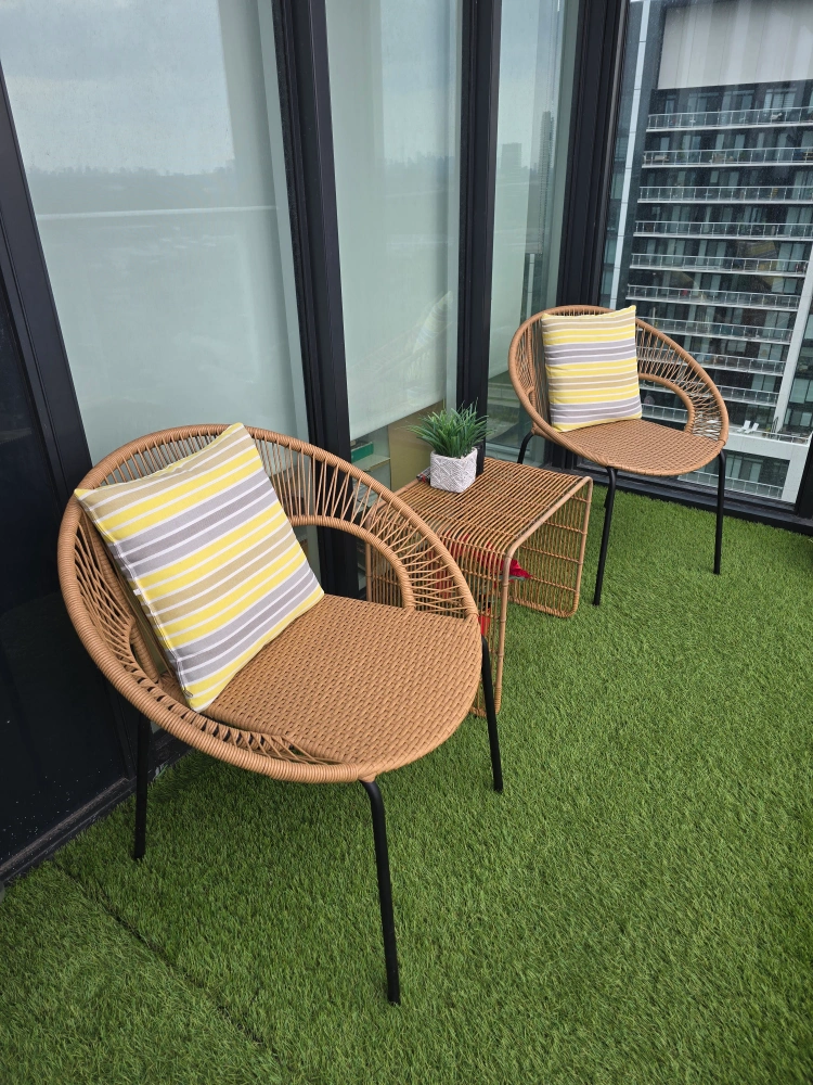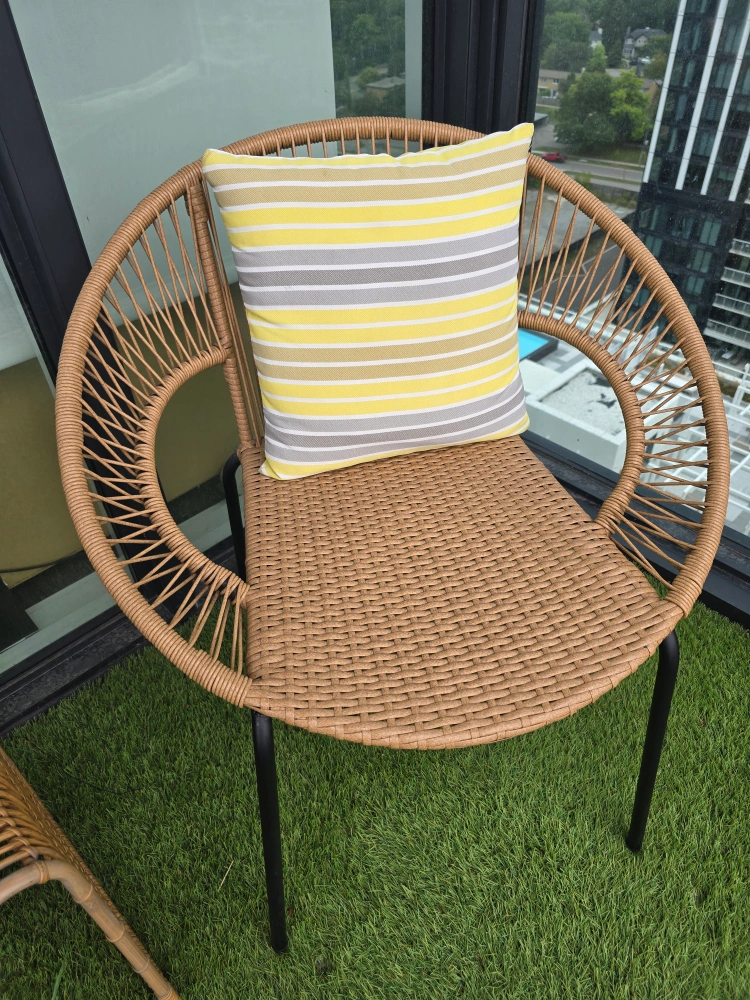 76Selling a cute outdoor rattan chair set, perfect for a balcony or small patio! Includes two chairs with comfy cushions and a matching side table. They're in great shape and ready to add some style to your outdoor space
