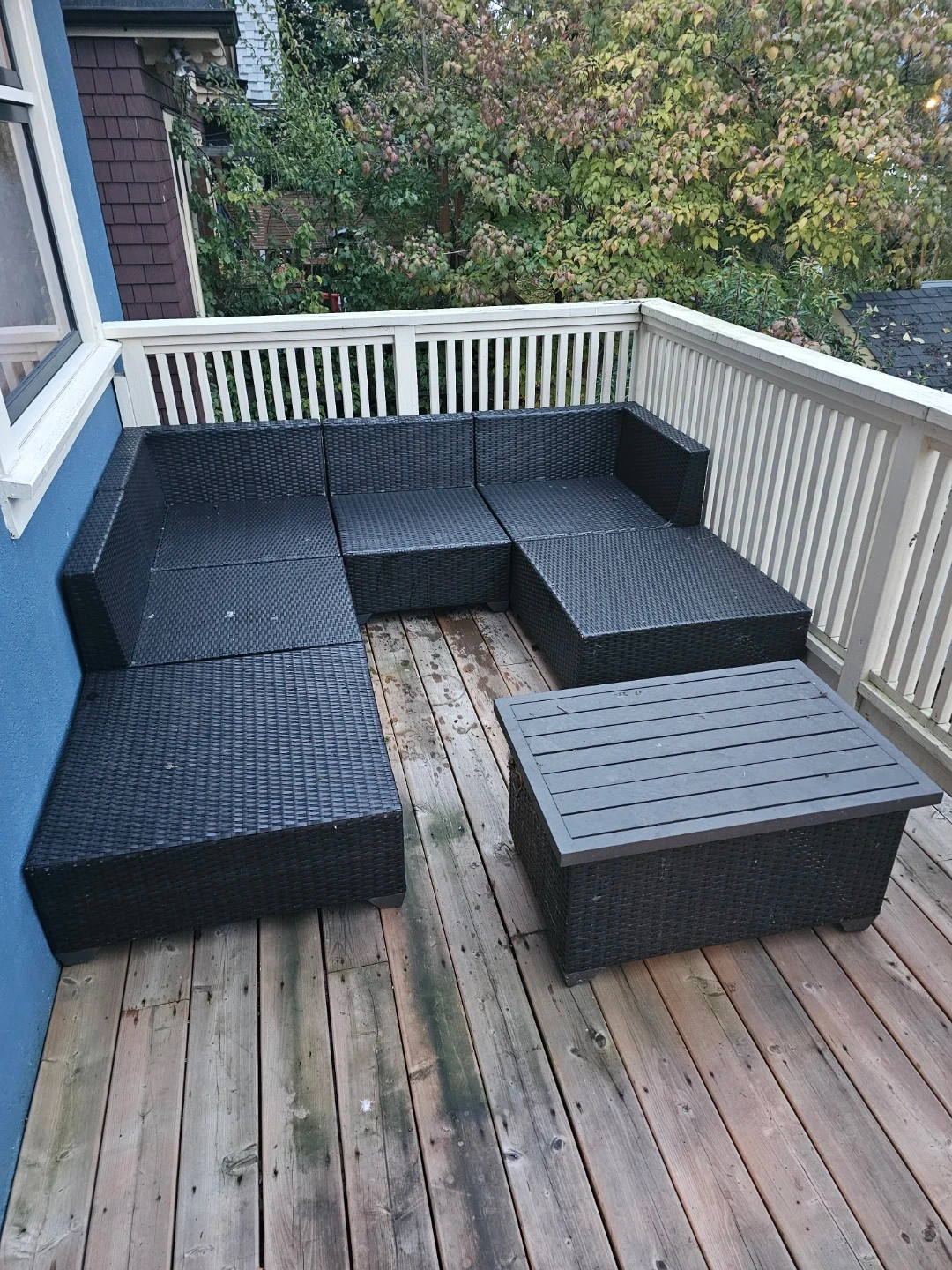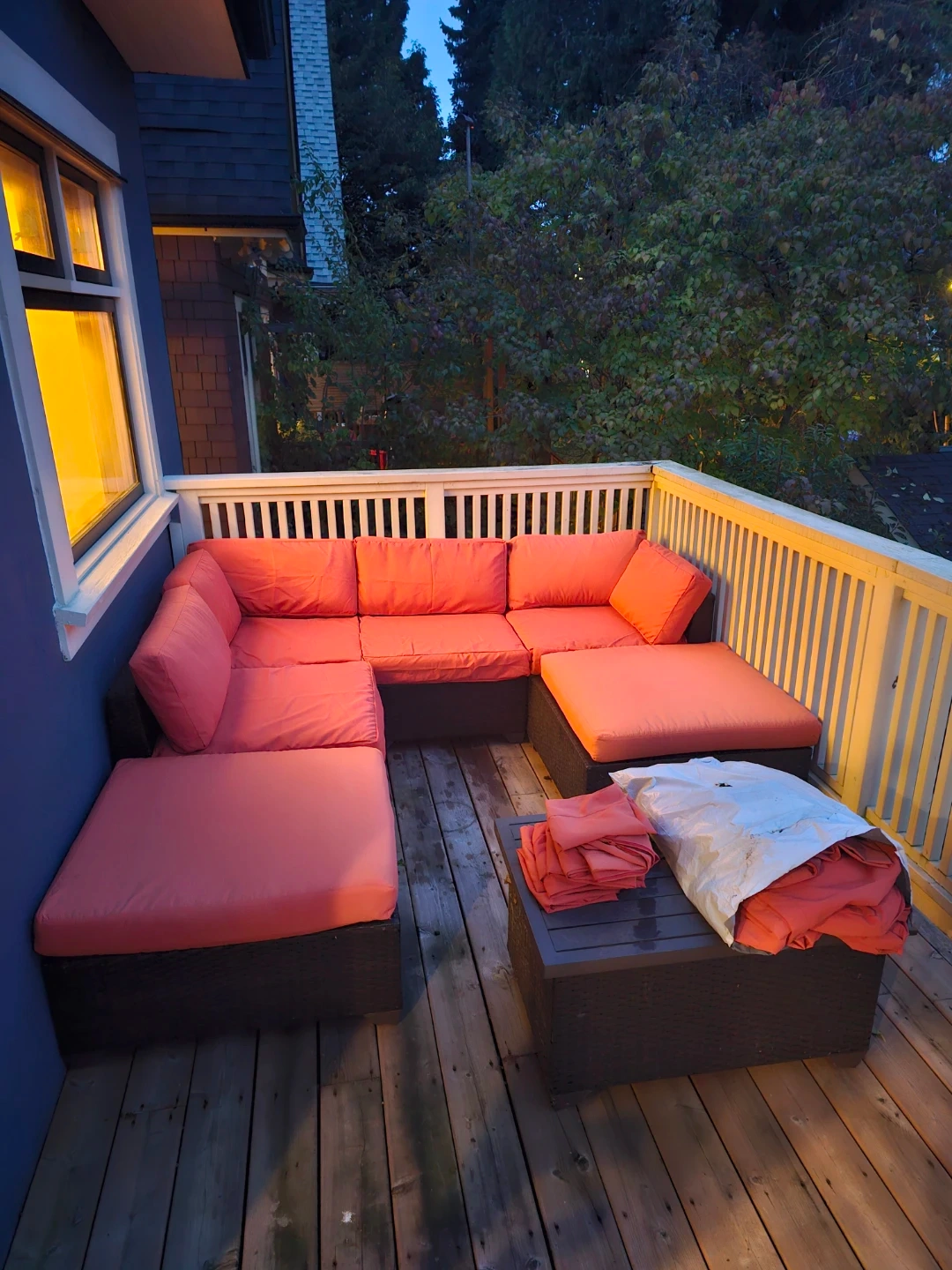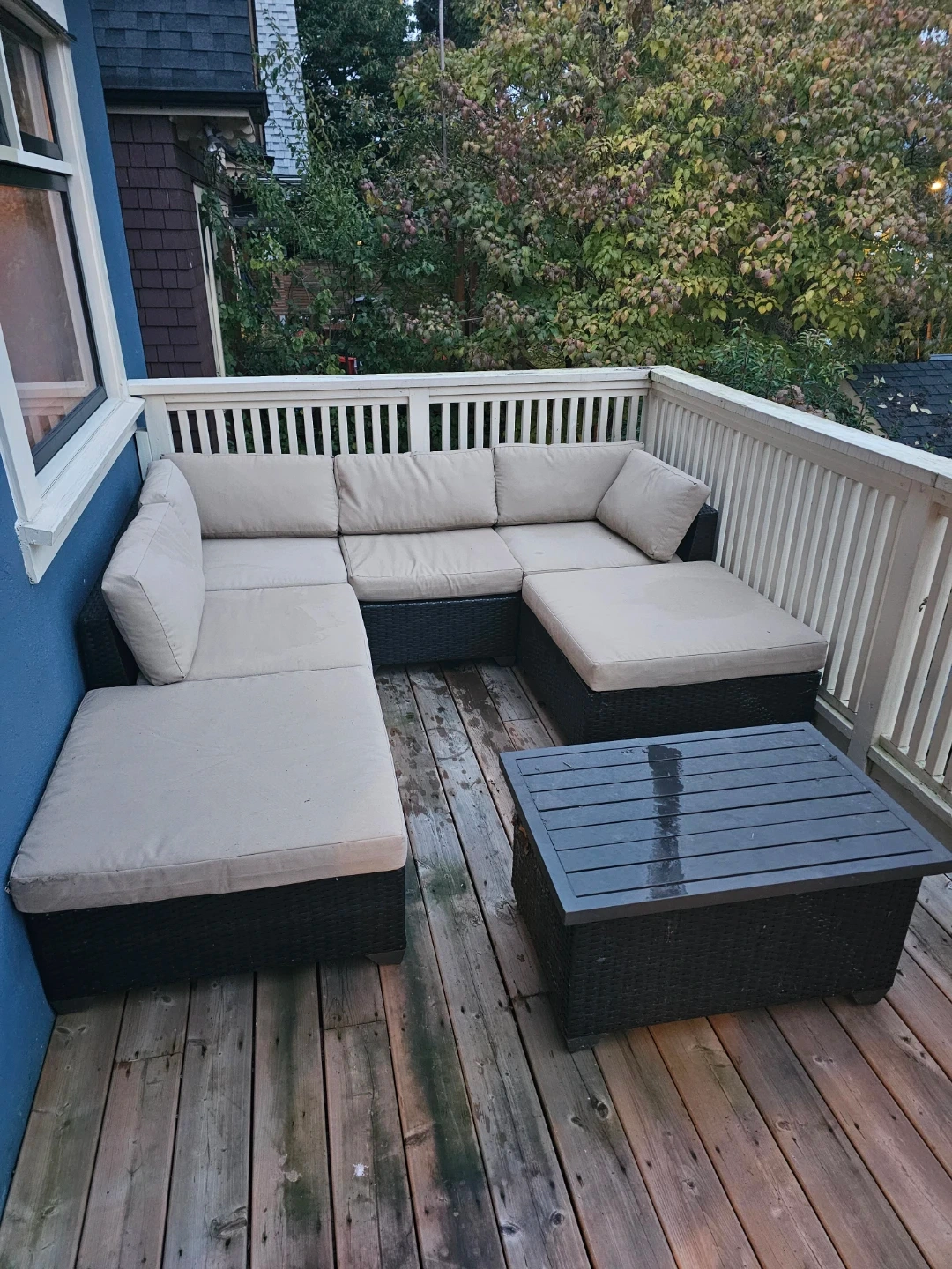 40Selling an outdoor sectional sofa set! It's in great condition and perfect for enjoying the outdoors. Comes with multiple sections to arrange as you like, plus a coffee table. Great for patios, decks, or gardens! Cushions come complete with beige covers, and orange all-weather covers (+ spares) Approx dimensions are 91" x 91"