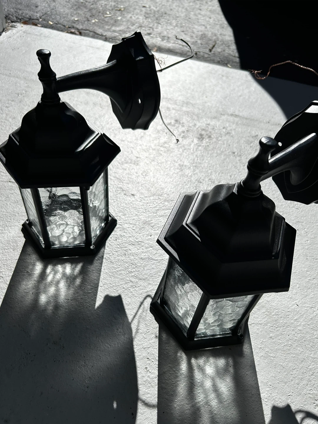13Selling a pair of outdoor wall mount lanterns in black. They have a classic design with a textured glass shade. Great for adding some light to your porch or patio!
