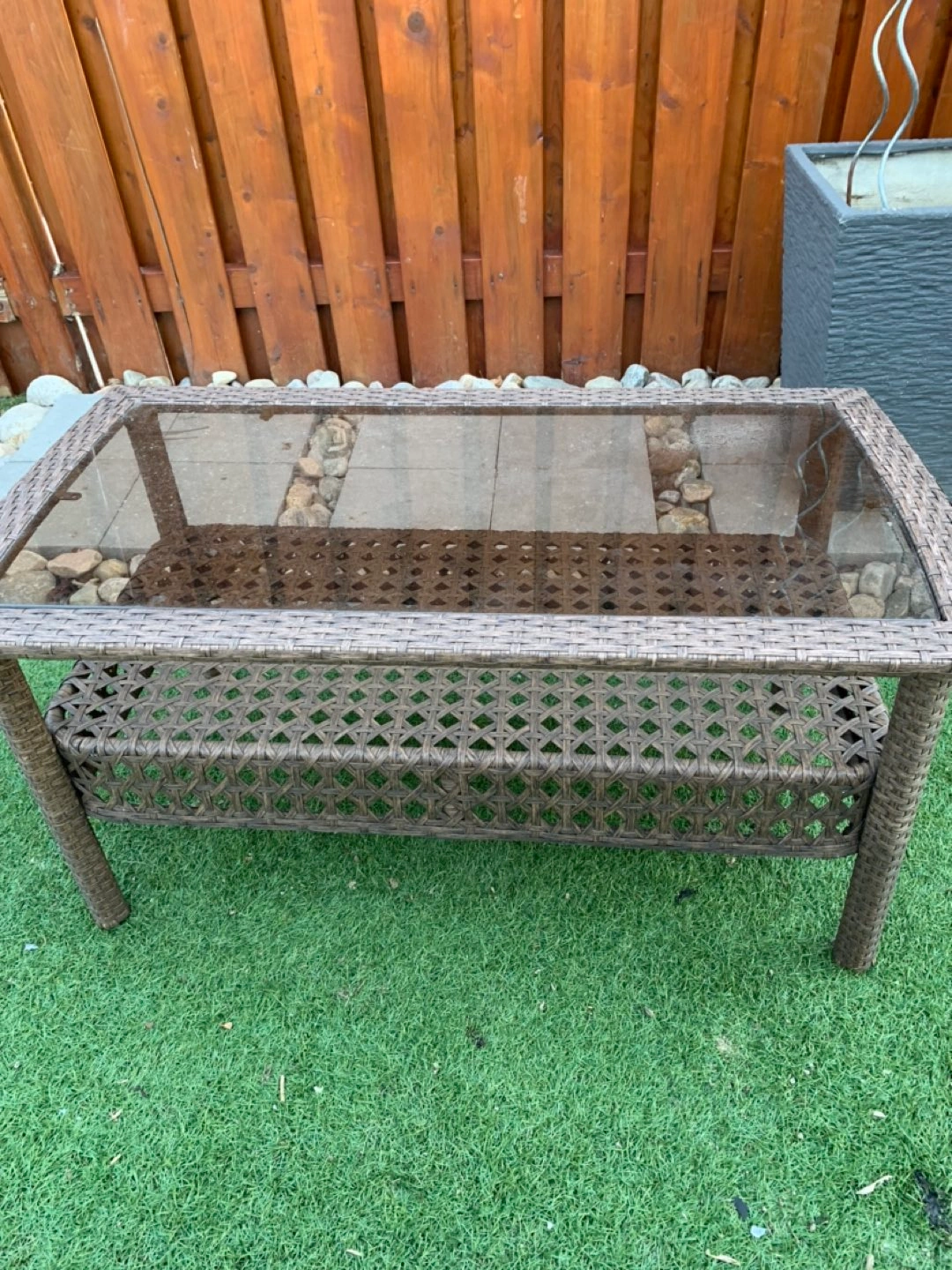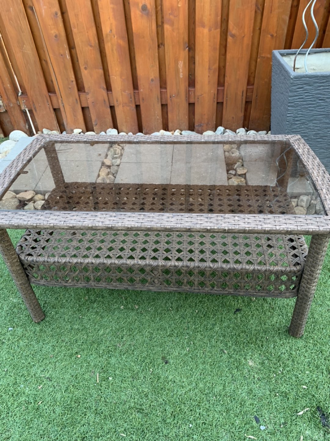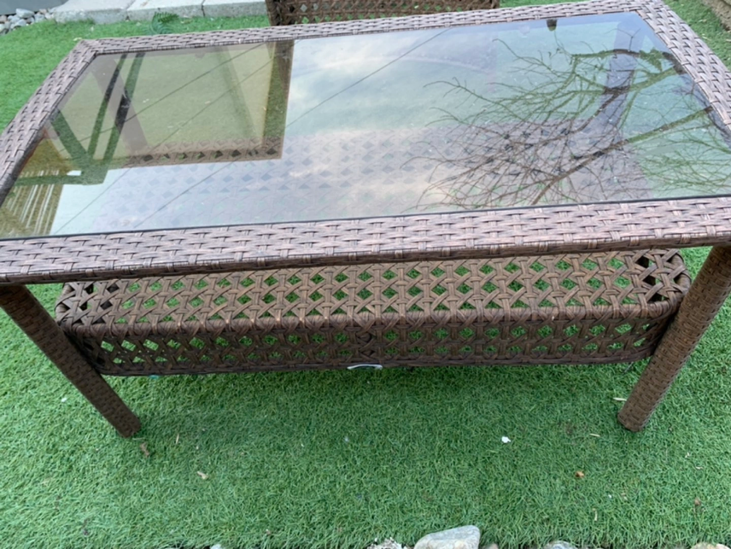 Outdoor brown wicker coffee table. Measures at 21” W x 18” H x 38” L.. Pick up only. Closest intersection is Jane St and Eglinton Ave west. Also have a matching chair for sale too. Please see my other