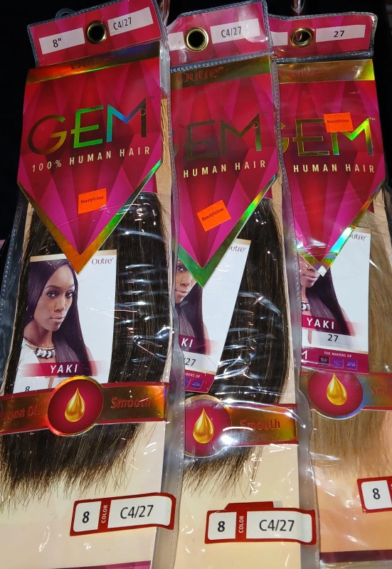 Outre Gem Yaki 100% Human Hair Weft available in colour 27 and size 8". This hair weft is smooth and infused with argan oil. 3 packs available, colors are 27 & C4/27.