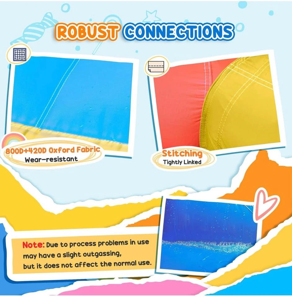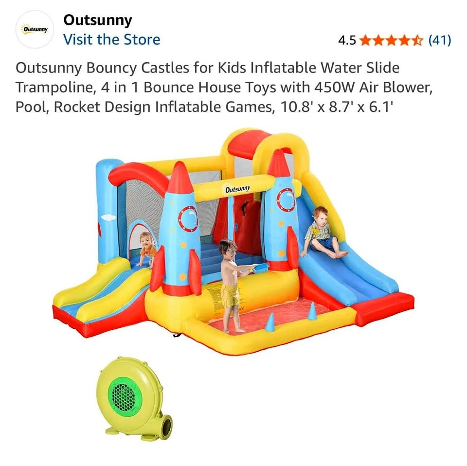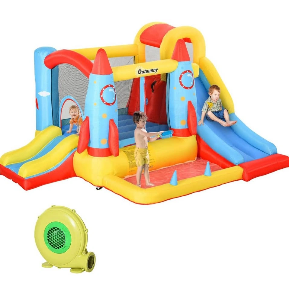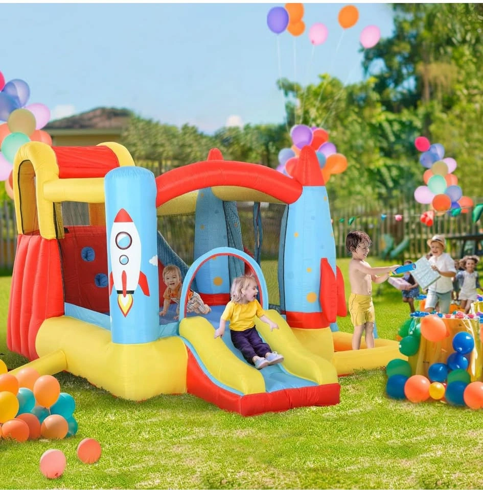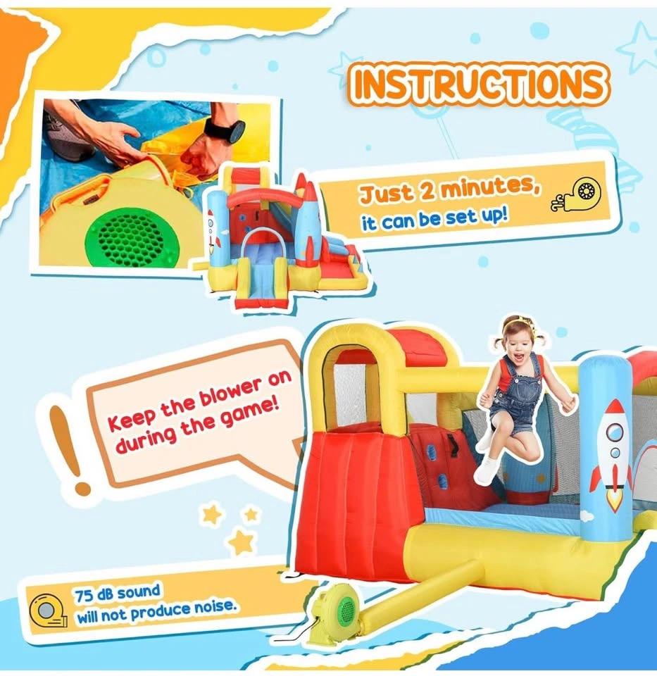 108Used only 3-4 times. Inflates quickly with the included electric air blower in just about 2 minutes. It's safe and secure with 9 ground stakes. Made of water-resistant oxford fabric, it can accommodate 4 children from 3 to 8 years old (no more than 66lbs per child; 264lbs total). It has a trampoline, 2 slides, a climbing wall, and a pool. Comes with a handbag for carrying and 2 patches of each color. Dimensions: Overall 130"L x 104.25"W x 72.75"H; Trampoline 54"L x 53.25"W; Pool 59"L x 25.5"W; Slides 70.75"L x 17.75"W (big), 37.5"L x 15.75"W (small). Pick up in Courtice. Please check my other listings!