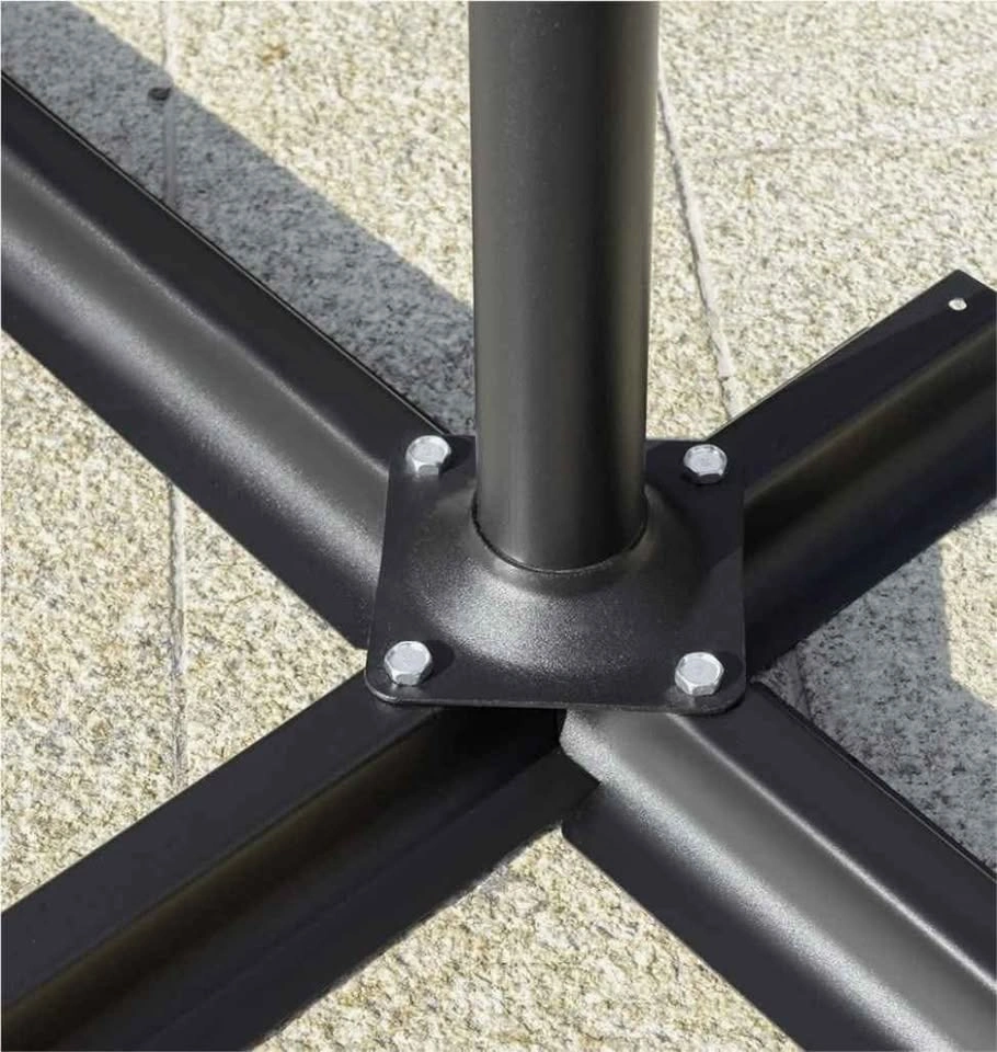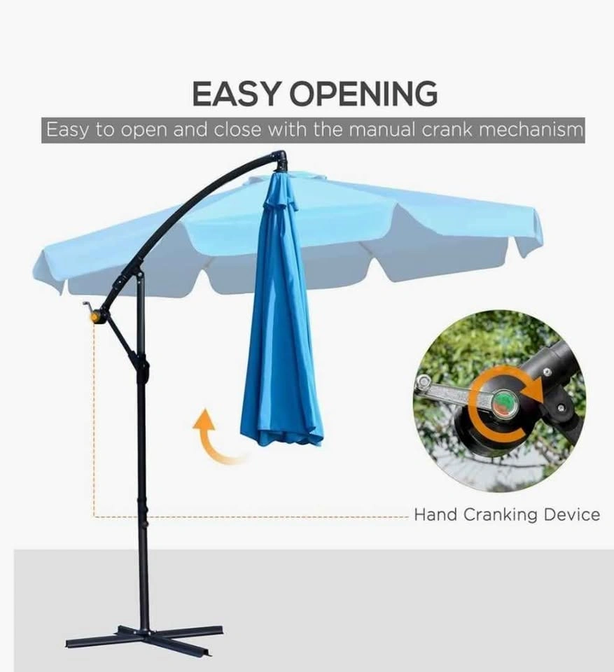 This offset cantilever umbrella can cover large patio furniture that doesn't have a hole to mount a standard umbrella to. Use it to cover outdoor sectionals, pool lounge chairs, or patio dining sets to provide comfortable shade even in difficult situations. Tough steel frame for extra strength. Connected to the canopy with 8 ribs for stability. Open and close the large patio umbrella in seconds with the easy-to-turn crank handle. The offset patio umbrella can stand more stable by adjusting knobs on the column of the umbrella base. The top vent of the polyester canopy allows air to pass through, helping to prevent it from lifting the offset umbrella. Overall Dimension: 8.7' x 8.7' H, Pole Size: 2". Assembly required. Item Weight: 25.08 lbs.