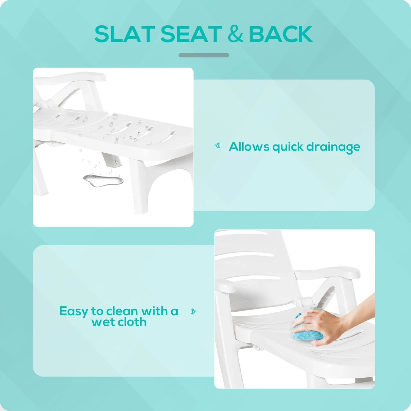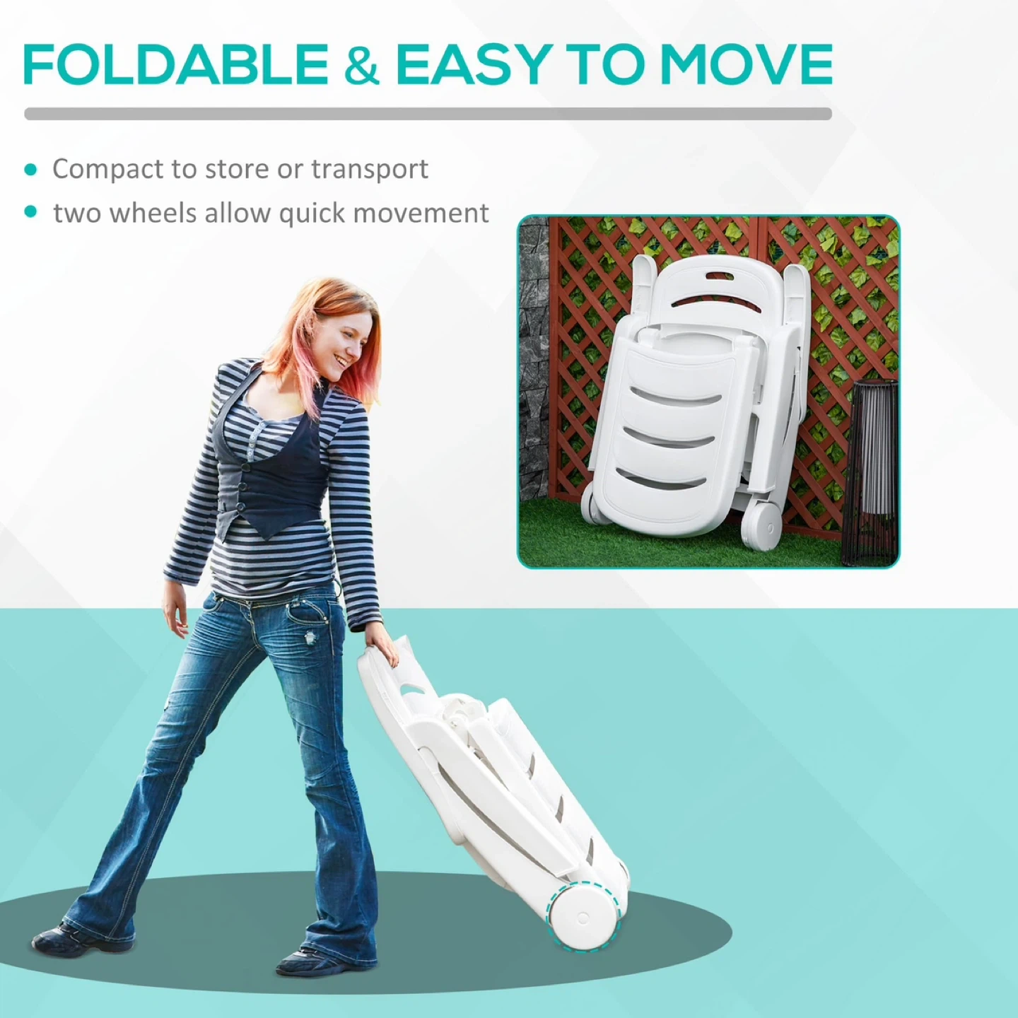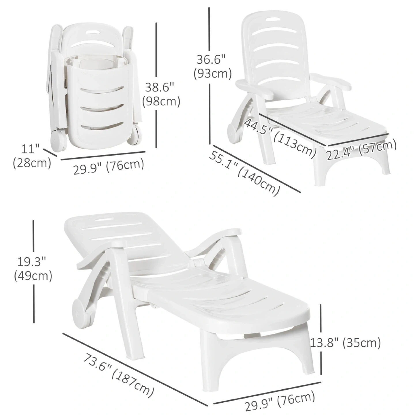 114Brand Outsunny Colour White Material Polypropylene Product Dimensions 76D x 187W x 49H Centimetres Item weight 28.6 Pounds Back style Tight Back Reclining Outdoor Pool Chair: Our plastic outdoor lounge chair is designed for exceptional comfort. It offers 5 reclining positions, allowing you to discover your preferred sunbathing angle and immerse yourself in a blissful, relaxing experience. Portable Lounge Chair: Our beach lounger is designed for ease of use. With its swift-folding feature, setting up, tearing down, and storage is a breeze. It's compact enough to fit snugly in your car's trunk or garage, occupying minimal space. This means you can effortlessly transport our pool lounge to any location without any hassle. Easy to Move with Swivel Wheels: Our patio lounger is versatile beyond the poolside. Once folded into your trunk, you can effortlessly wheel it away on its reliable, all-terrain swivel wheels to your next outdoor adventure. Whether it's a beach trip or an outdoor event, our chair makes outdoor seating a breeze. Waterproof Plastic, Pool Ready: Our reclining Patio chair is a testament to our unwavering commitment to durability. It's meticulously crafted from top-notch, waterproof polypropylene with a slatted design, ensuring rapid drainage. With a robust weight capacity of 330 lbs., it's prepared to withstand any pool party or outdoor event, assuring you of a wise, long-lasting investment. Folding Outdoor Chaise Lounge Chair Information: Overall Dimensions: (Fully Reclined) 73.6" L x 29.9" W x 19.3" H (187 x 76 x 49 cm). (Upright) 55.1" L x 29.9" W x 36.6" H (140 x 76 x 76 x 93 cm). (Folded) 38.6" L x 11" W x 29.9" H (98 x 28 x 76 cm). Weight Capacity: 330 lbs.