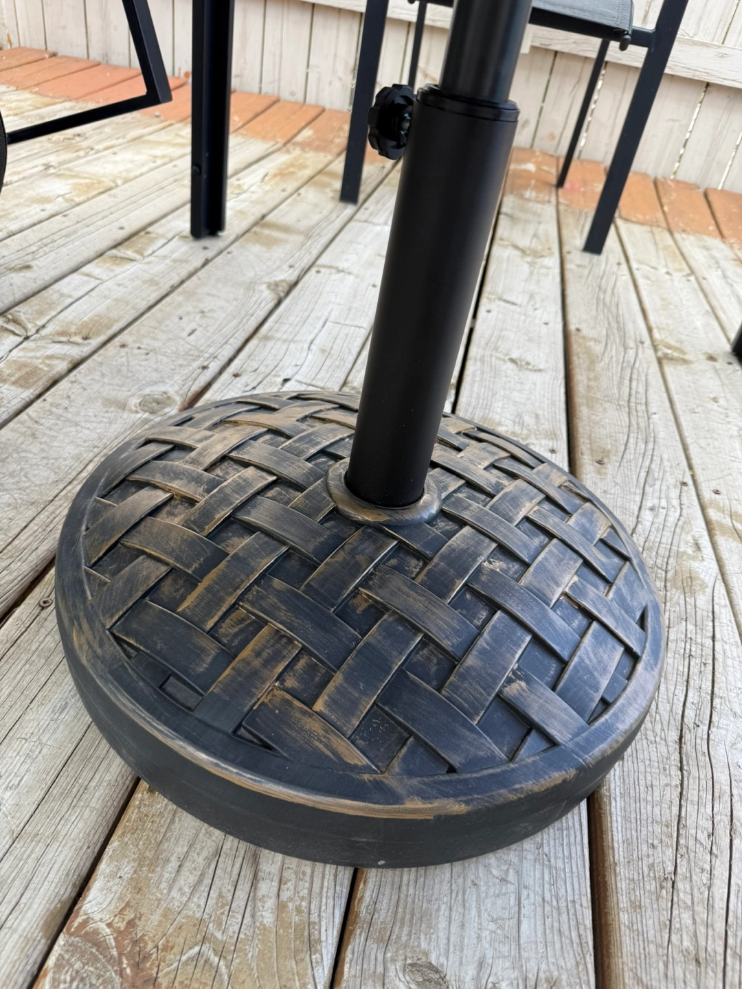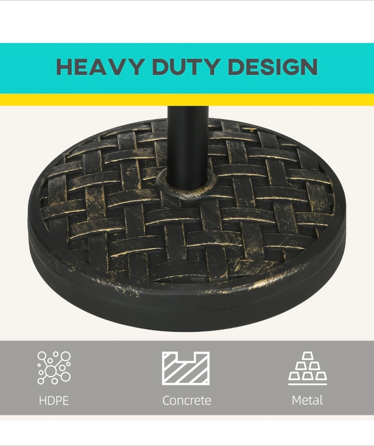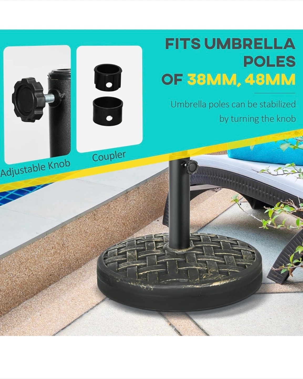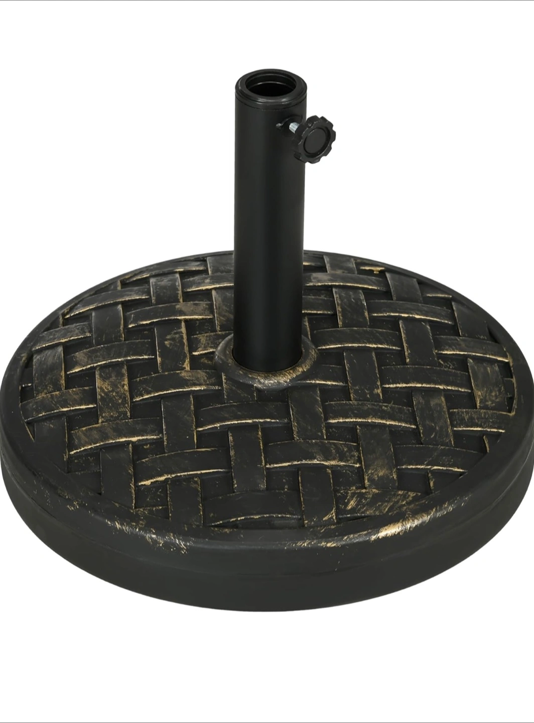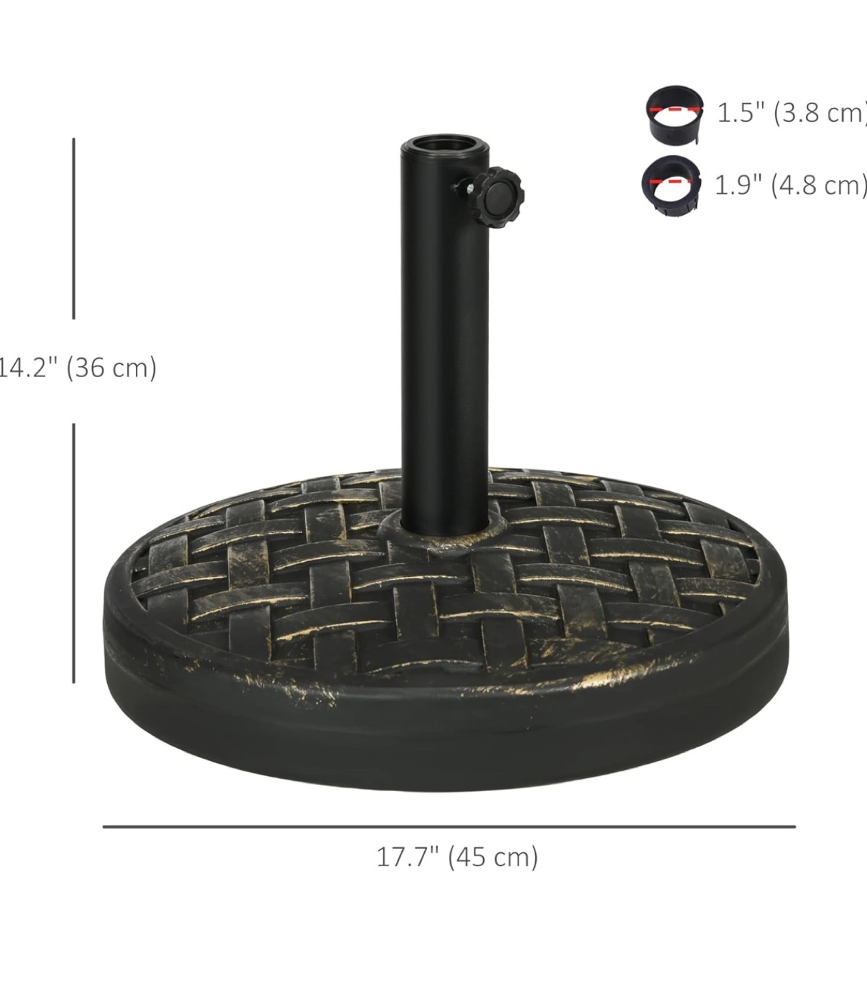 91Outsunny 40lbs. Concrete Umbrella Base with Rattan Effect, Heavy Duty Round Umbrella Stand, Garden Umbrella Holder for 1.5", 1.9" Poles. Colour: Bronze Ended up not being needed as our umbrella is too big for our patio furniture(for sale at another post). Opted not to return it due to heavy weight. Got it for 64.99+tax Fixed price.