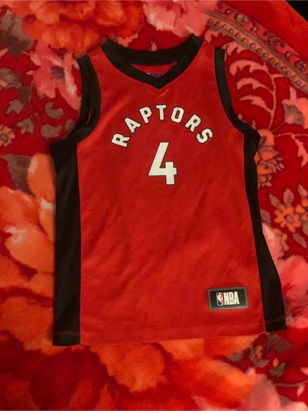 This is a Toronto Raptors jersey featuring Scottie Barnes and the number 4. It's red with black accents and the NBA logo is visible. Perfect for any young Raptors fan!