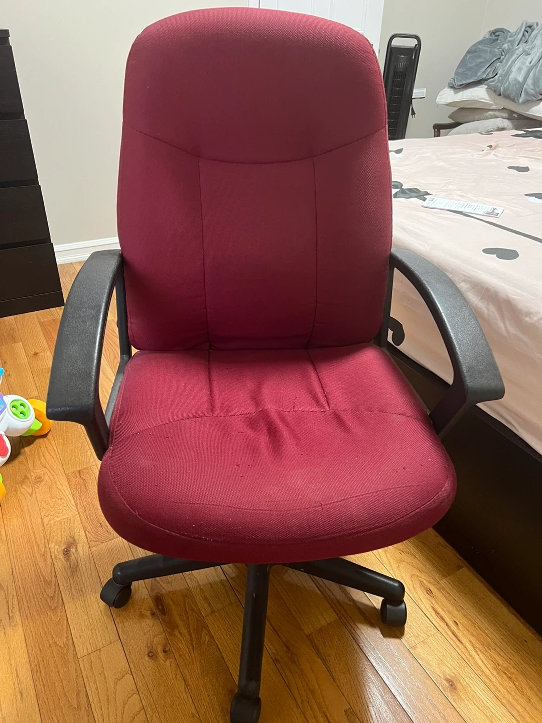 This is a burgundy office chair with rolling wheels. It has fabric upholstery and black armrests. It's a sturdy chair for daily use.