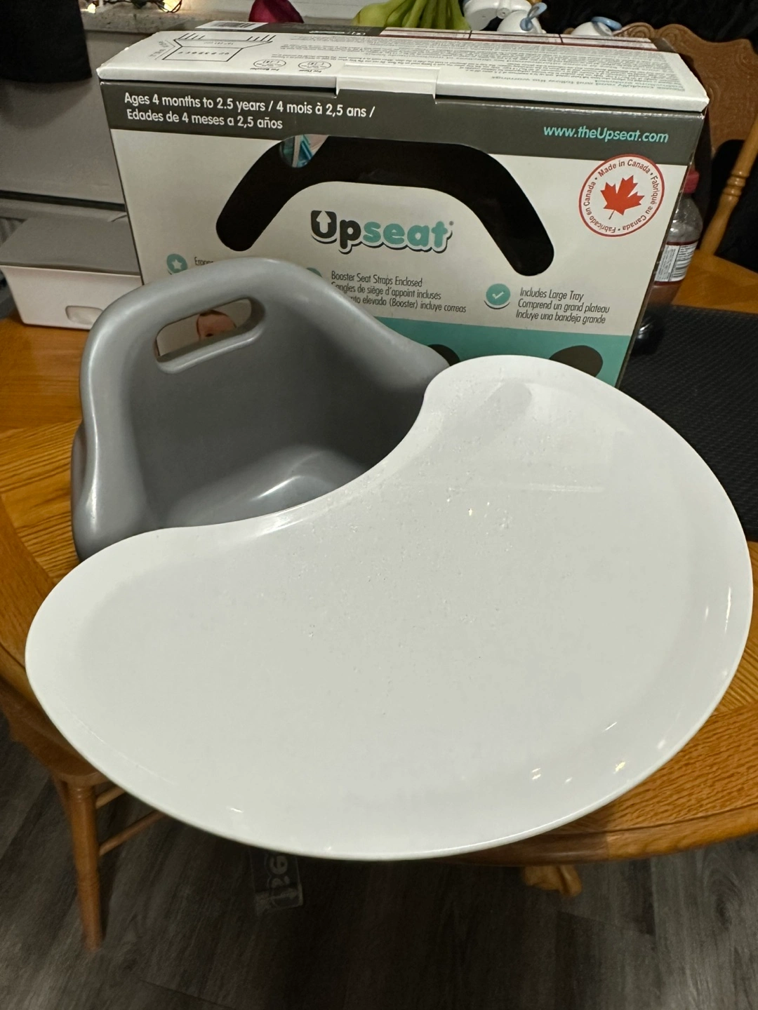 Grey booster seat with white tray. Suitable for children aged 4 months to 2.5 years. Like New condition, used less than a handful of times.