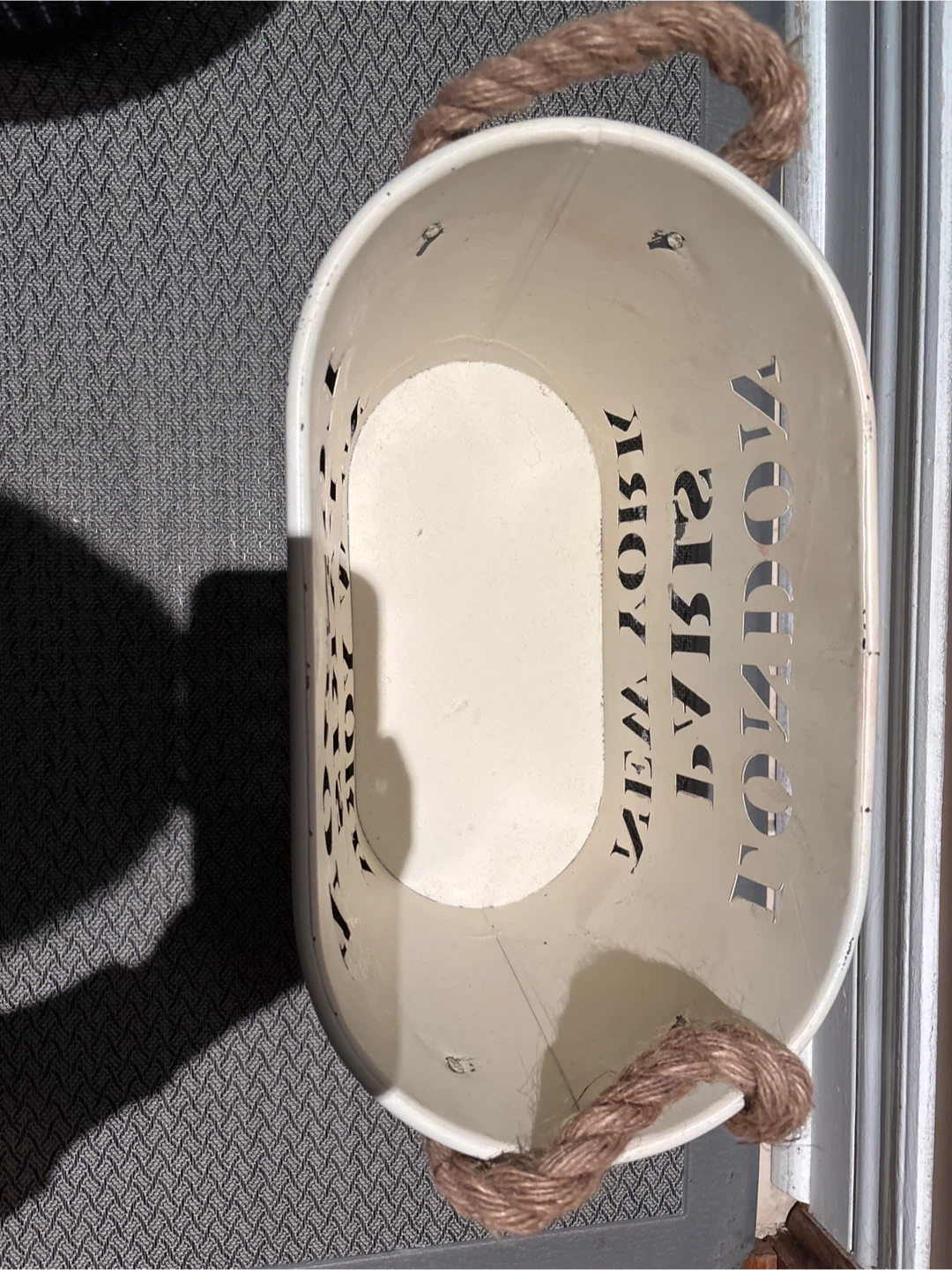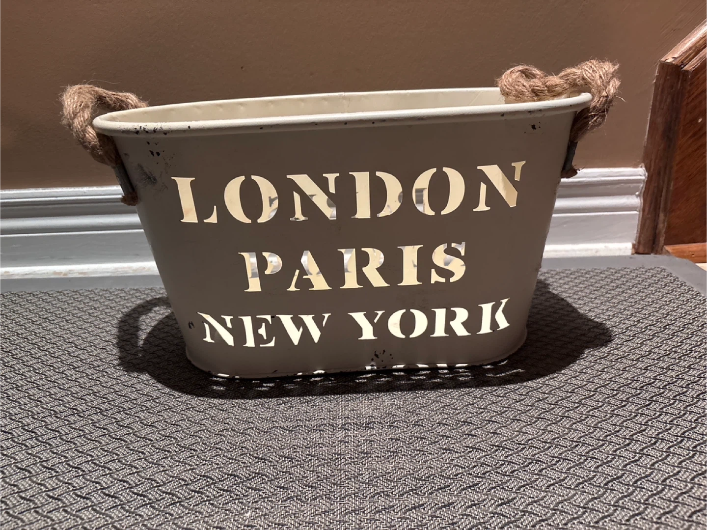 Here's a cute decorative metal bucket. It has rope handles and the words London, Paris, and New York cut out around the sides