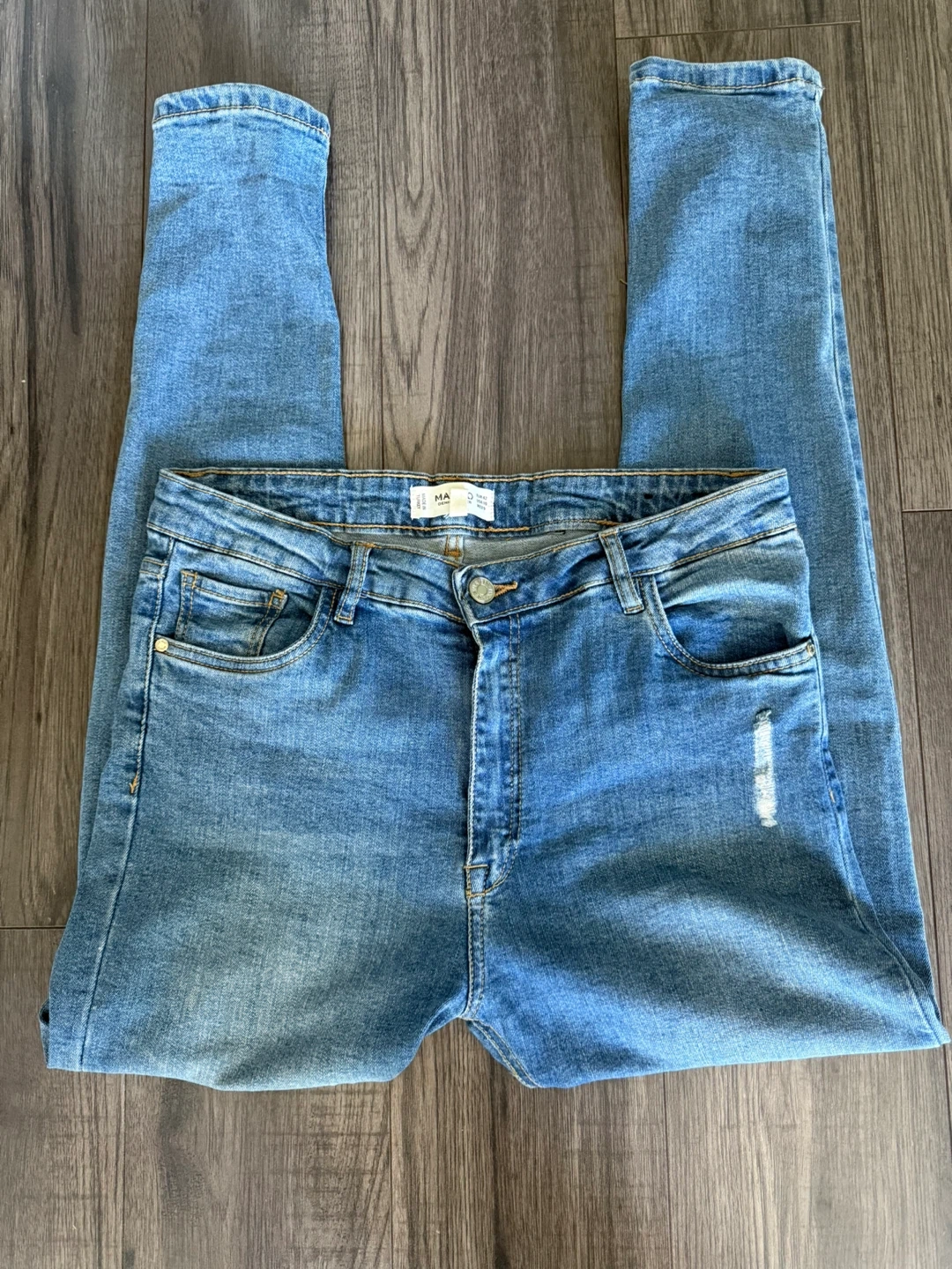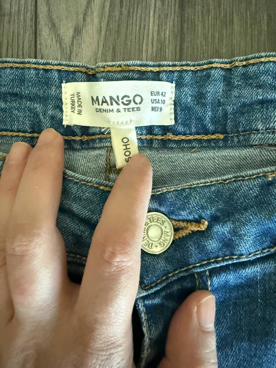 These are Mango denim jeans in a medium wash. They're a size 10 US. Made in Turkey.