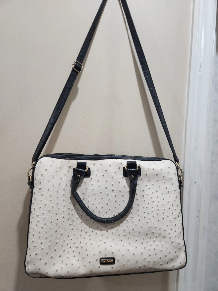 Beautiful off-white and black briefcase. Features an ostrich-print design and detachable shoulder strap. Gold-tone hardware. Zip closure. Great for work or travel.
