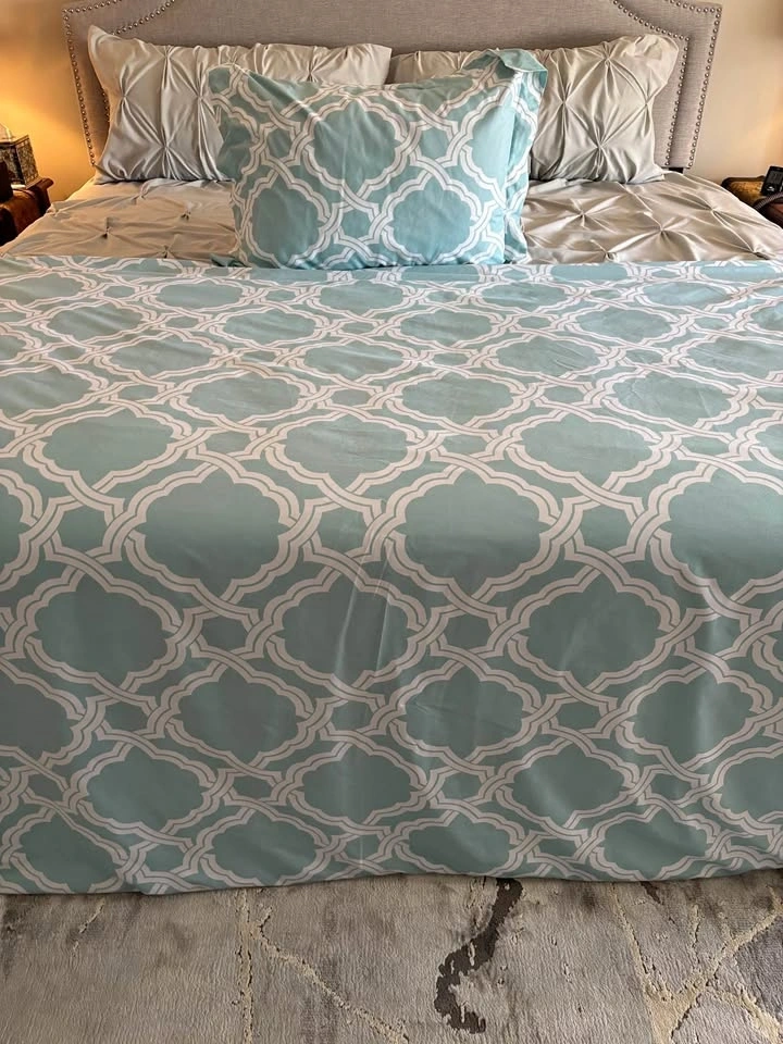 Pretty soft turquoise/white lattice pattern duvet cover/sham, Twin Size. Includes down alternative duvet. Used for staging only, never been slept on. 100% polyester. Cold water wash on gentle cycle. Smoke and pet free home. Keswick Pick Up.