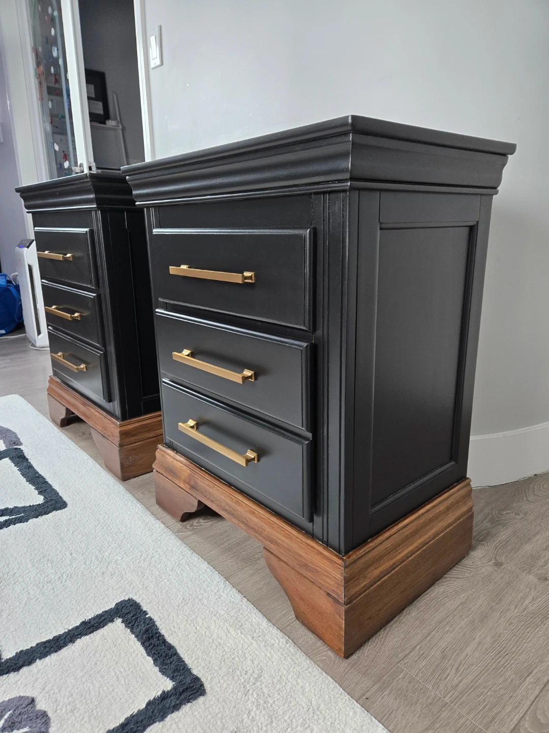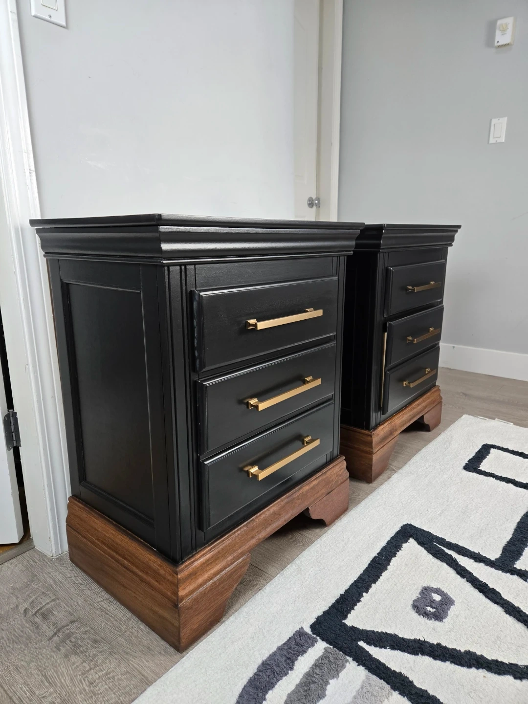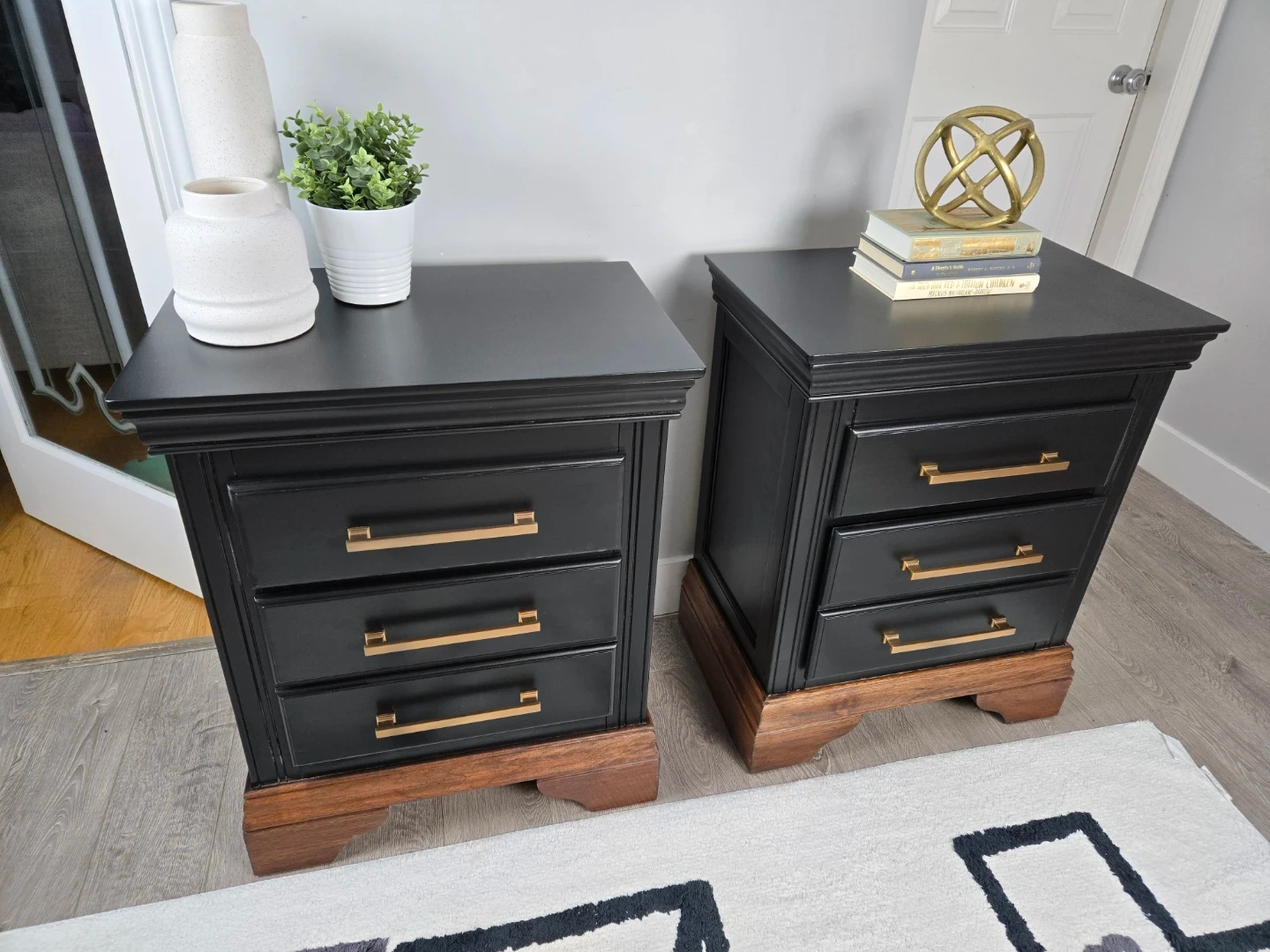 These 2 nightstands have been primed, spray painted and top coated with polyacrylic for durability.