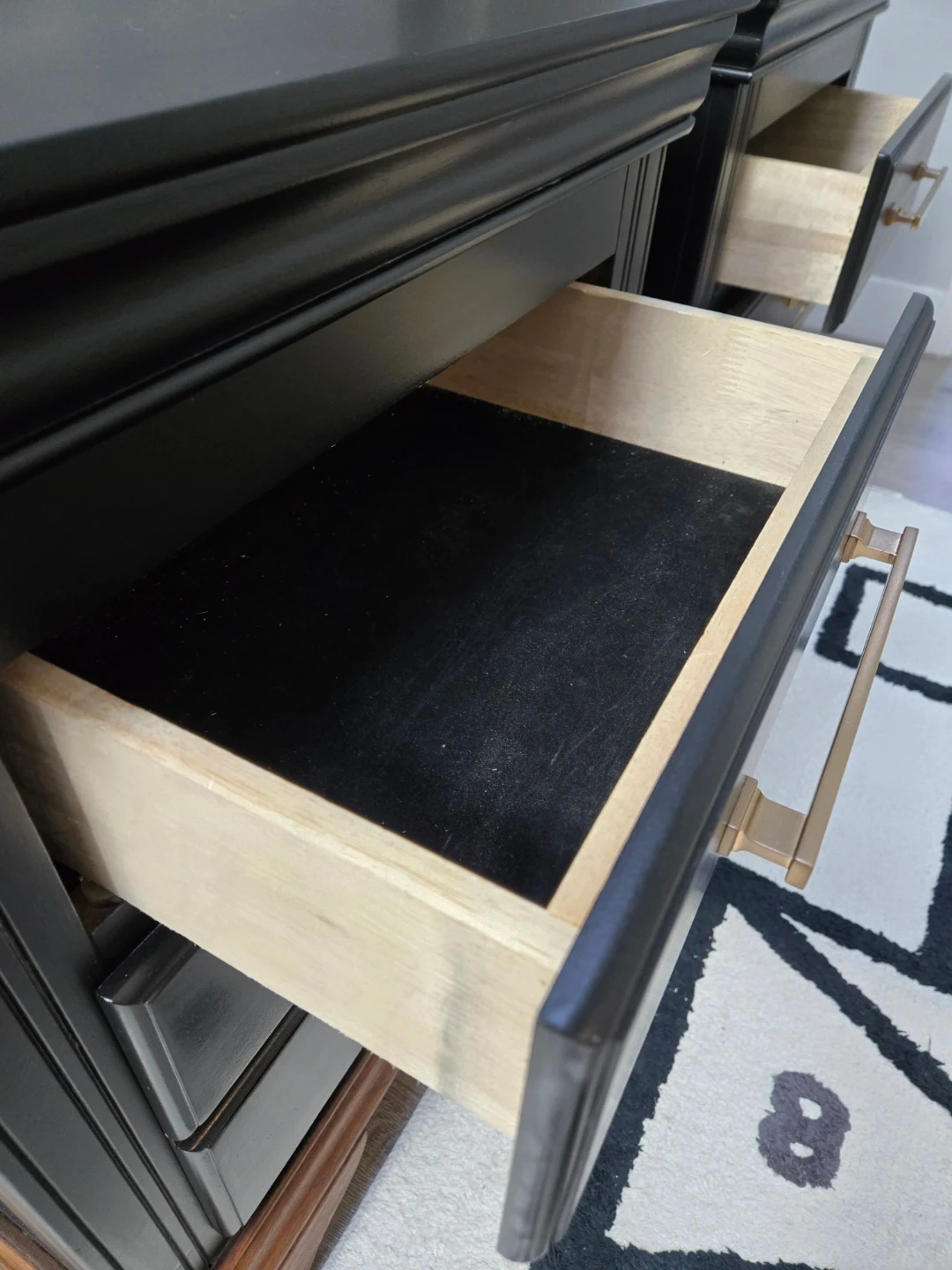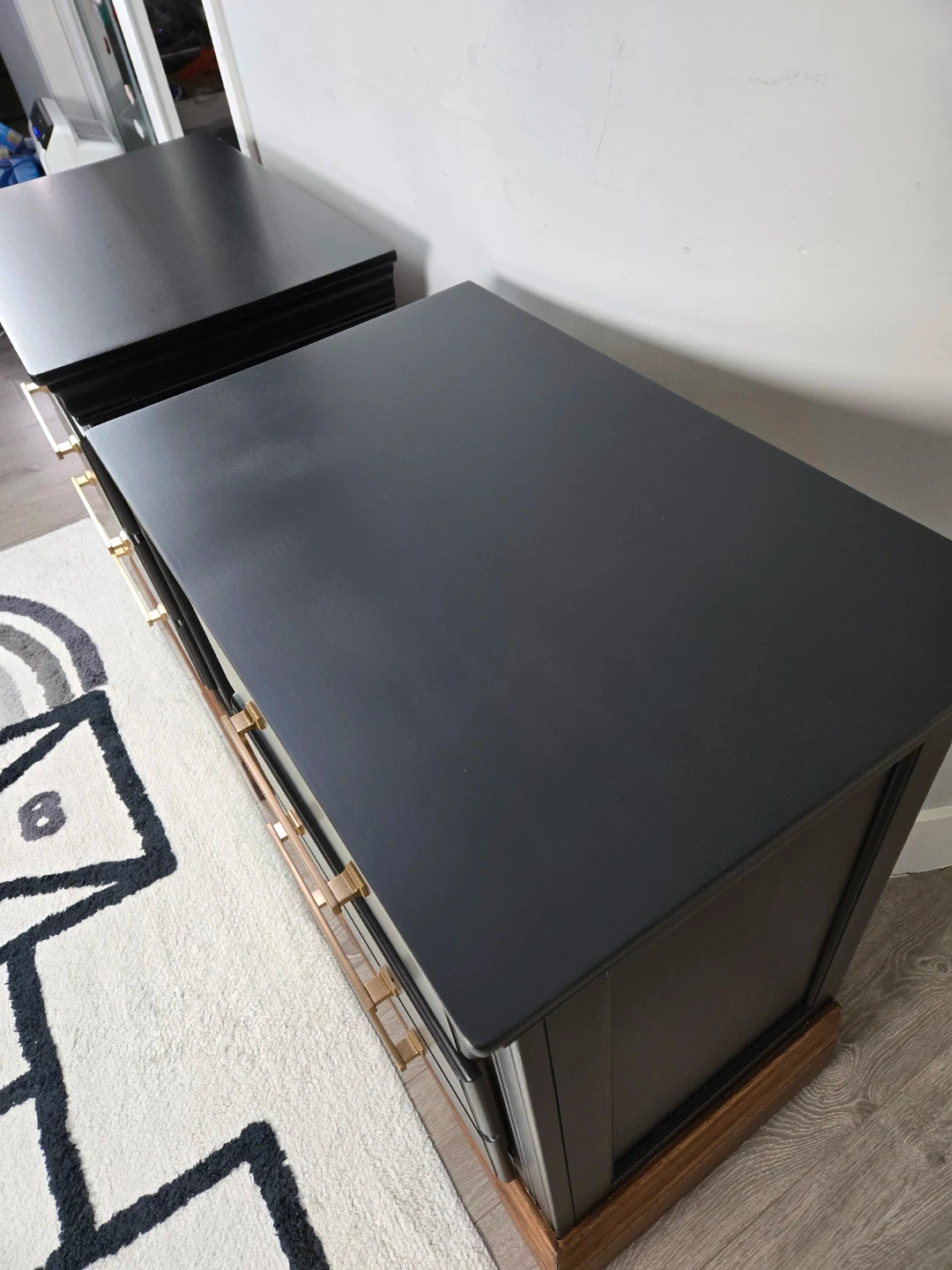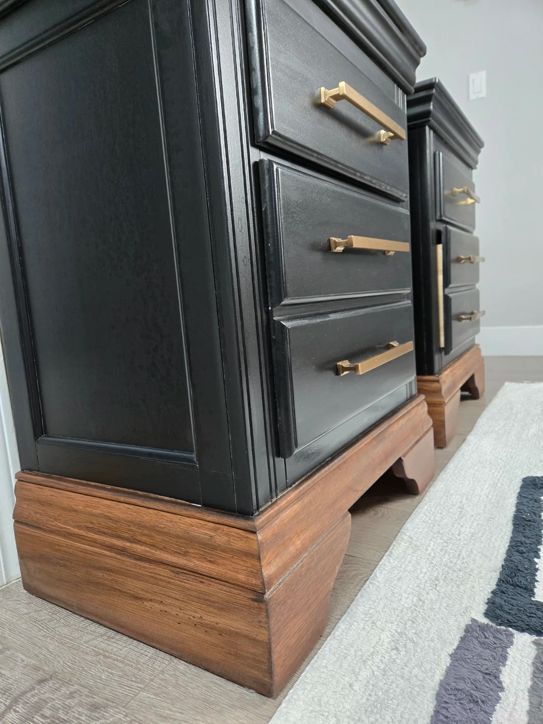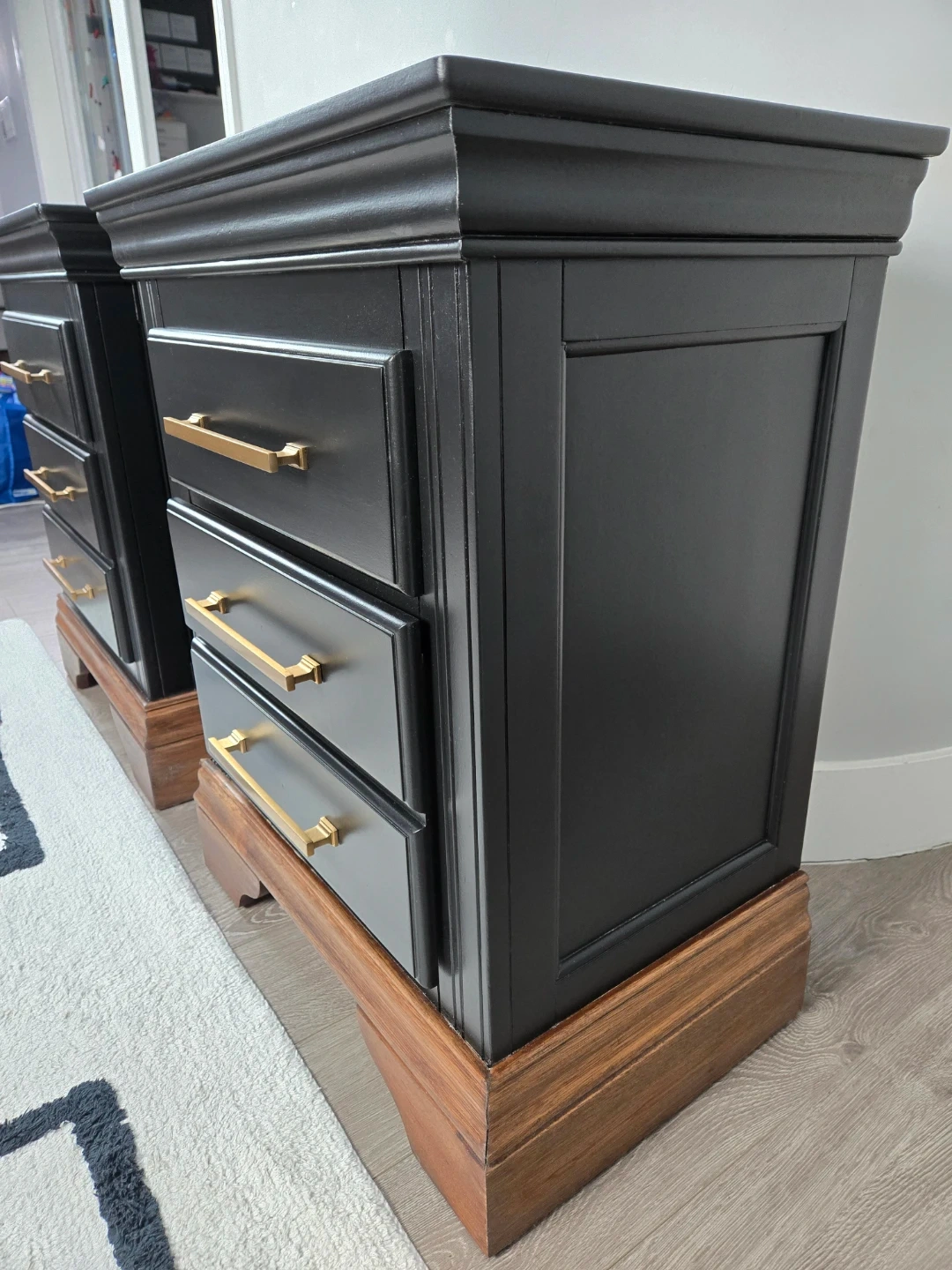 These 2 nightstands have been primed, spray painted and top coated with polyacrylic for durability.