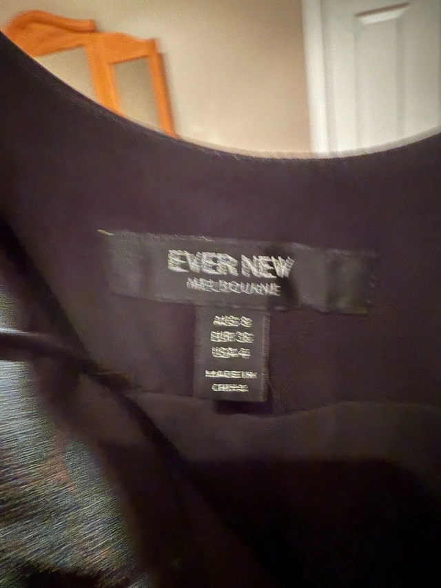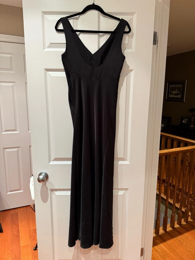 This is an elegant Evernew black dress, perfect for any formal occasion! The dress features a flattering silhouette and is made from a comfortable, flowing fabric. This dress is in excellent condition.