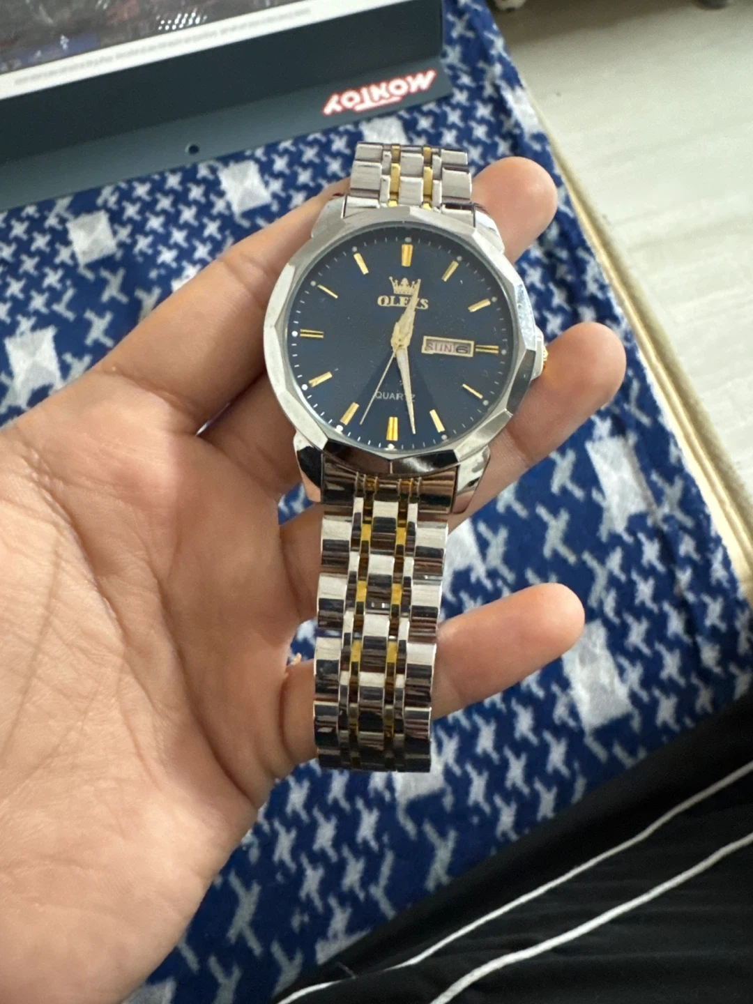 Selling an OLEVS quartz watch with a silver and gold band. It's in good condition and has a stylish look. The watch features a blue face and a quartz movement