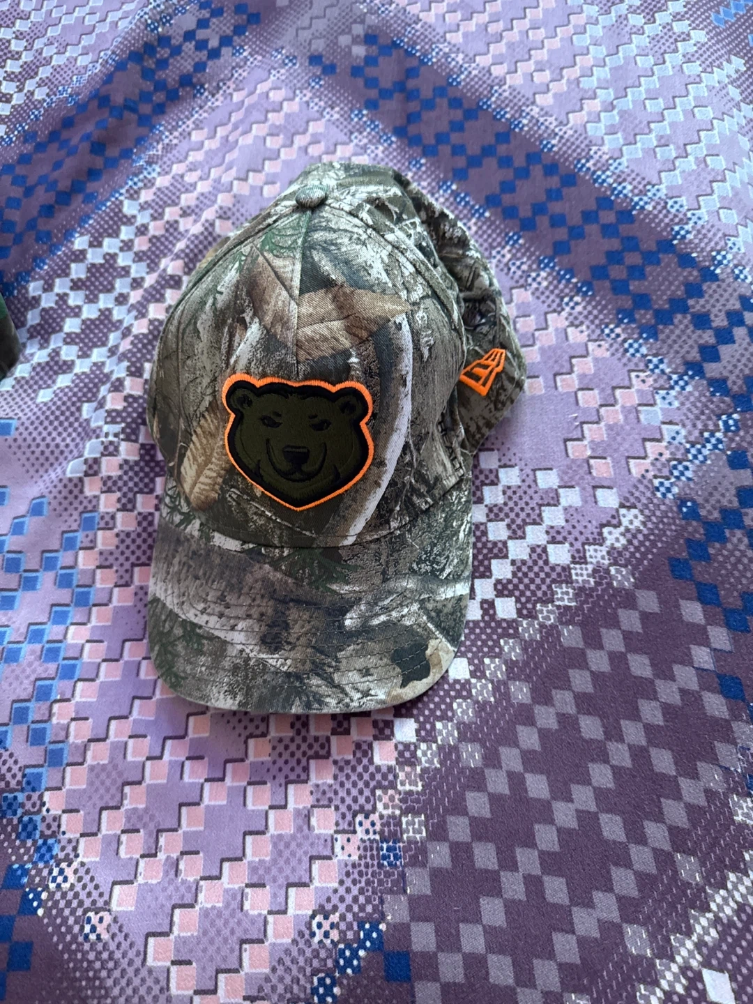 This is a camouflage baseball cap with embroidered patches. It features a bear logo on the front and a basketball logo on the side. This hat's design is great for outdoor activities or casual wear.