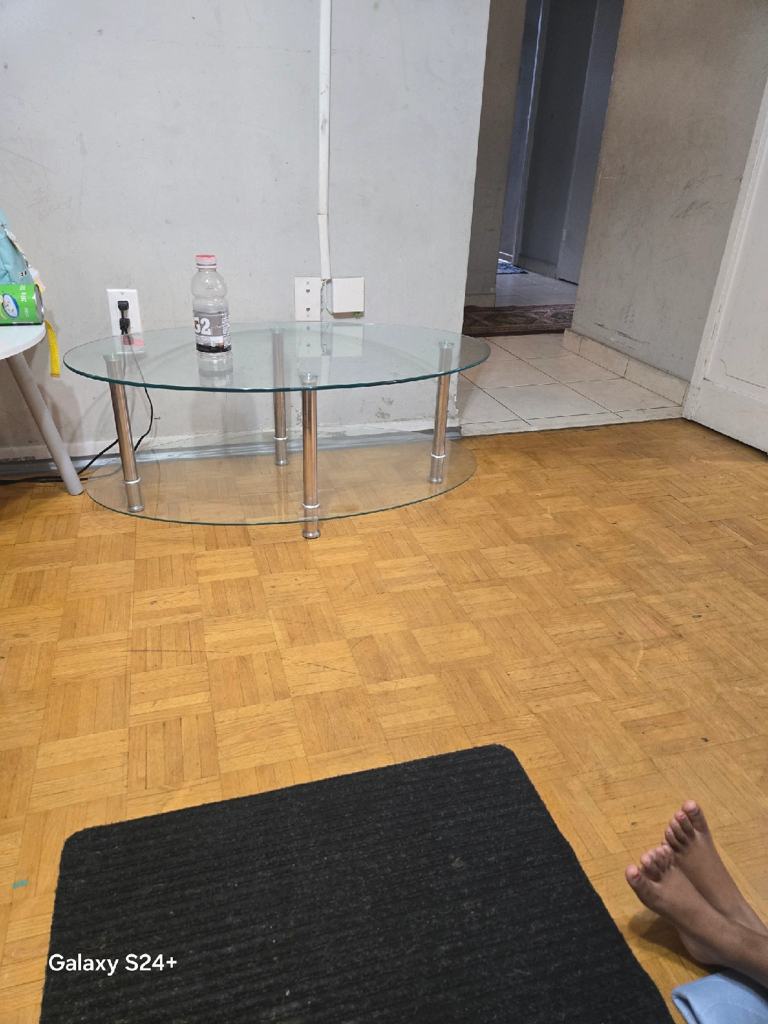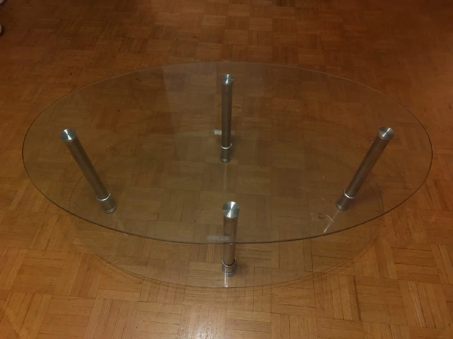 Selling an oval glass coffee table. It features a sleek glass top and sturdy metal legs. It's in great condition and would be a stylish addition to any living room!