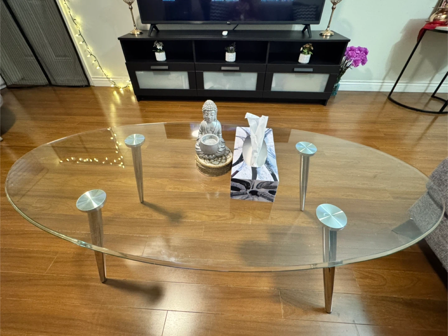 16Selling an oval glass coffee table. It's in great shape and would look lovely in any living room. The glass top is clear and the legs are a sleek silver colour. Perfect for adding a touch of elegance to your space!