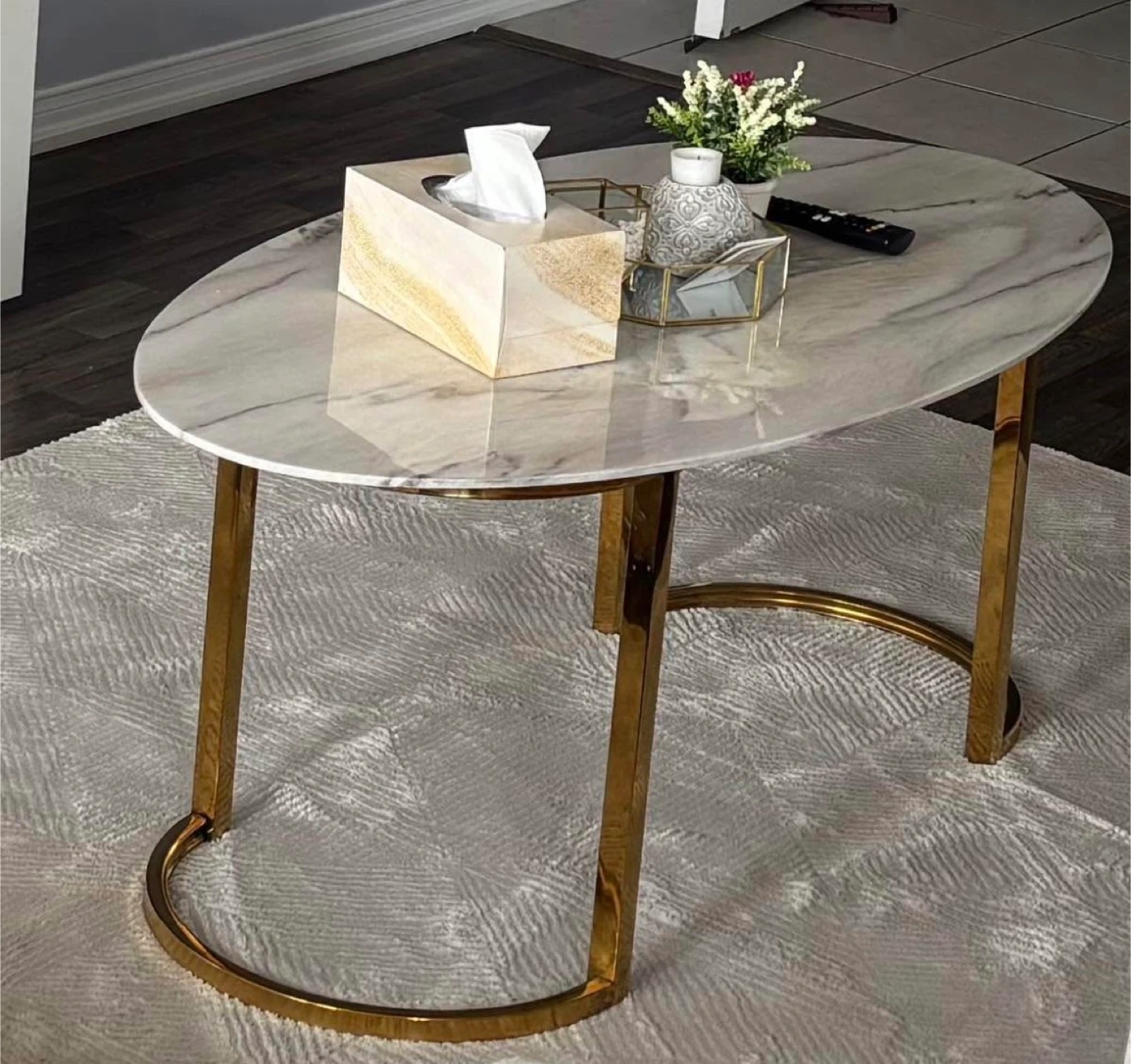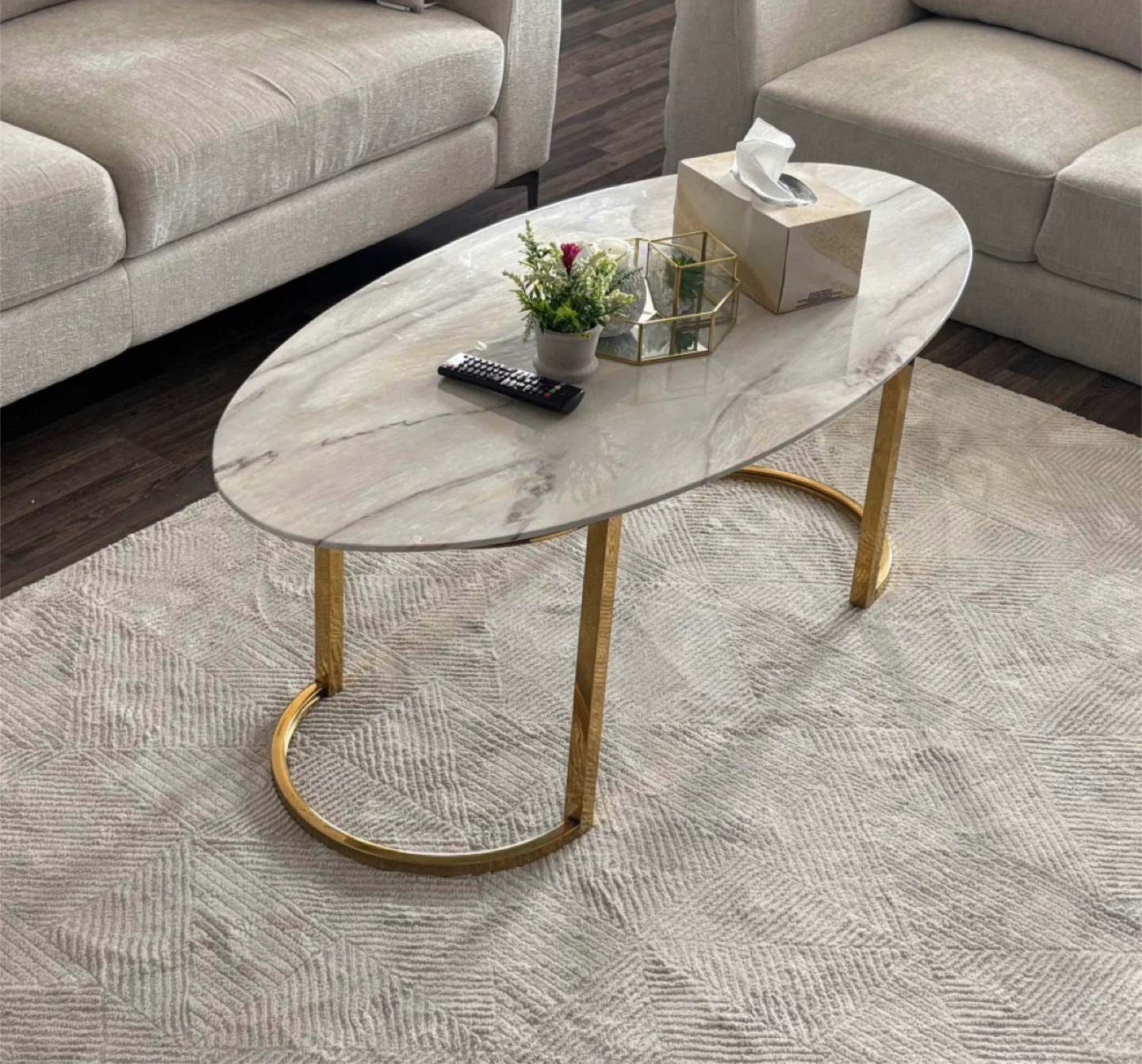 0Very elegant coffee table Need to be gone ASAP Selling a stylish oval coffee table 120*60 that would look great in any living room! It features a beautiful marble top and sleek gold legs. The table is in excellent condition and adds a touch of elegance to your space.