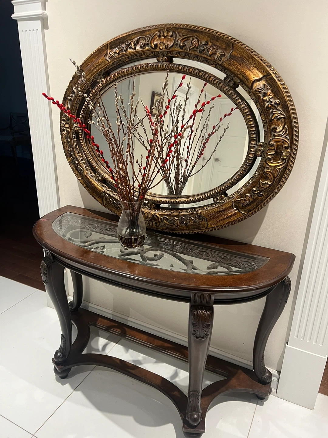 Selling a beautiful oval mirror with an ornate gold frame. It comes with a matching console table with a glass top and carved legs. It would be a great addition to any entryway or living room!
