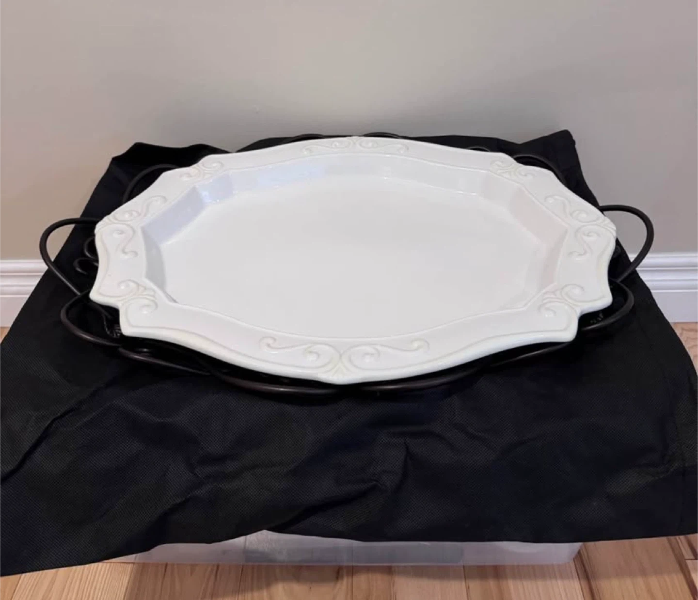 Selling a Certified International Bistro oval platter with a metal stand. The platter is white with a decorative edge, and the stand is black metal with a scroll design. It's a great way to display food or use as a decorative piece in your home