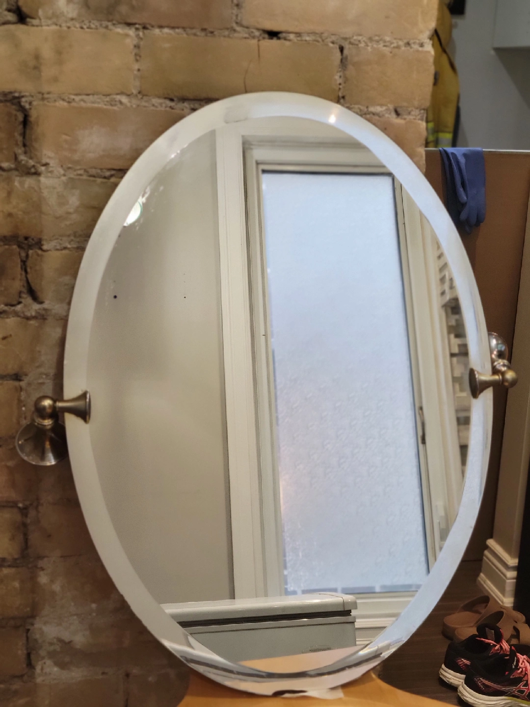 Selling an oval-shaped wall mirror. It has a clean, simple design that would look great in a bathroom or entryway. The mirror is in good condition and ready to be hung up in your home