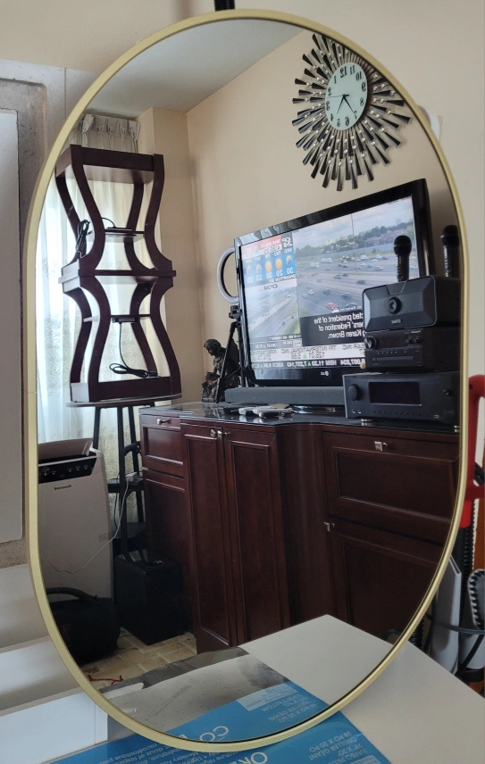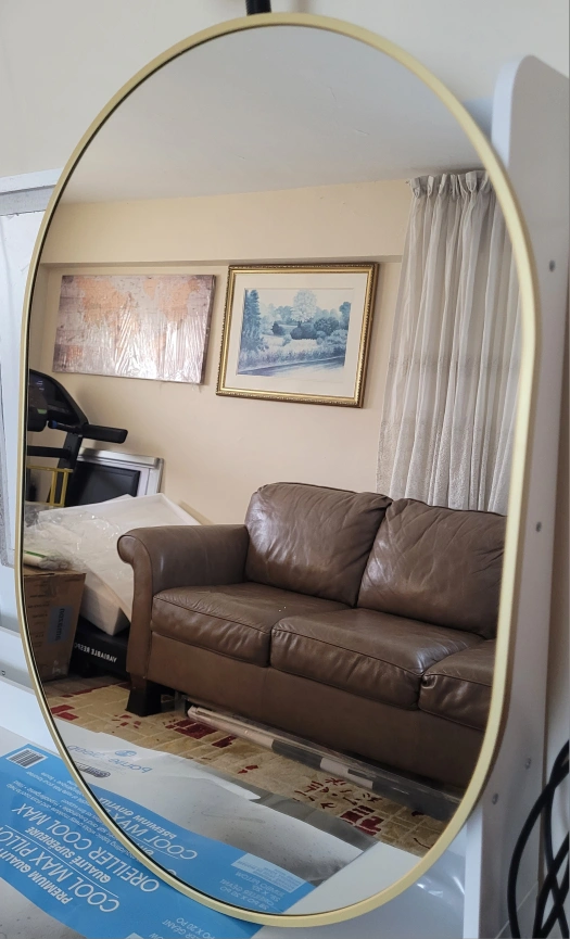Selling a stylish oval wall mirror featuring a sleek gold frame. It's in great shape and ready to brighten up any room in your home! Perfect for adding a touch of elegance to your decor